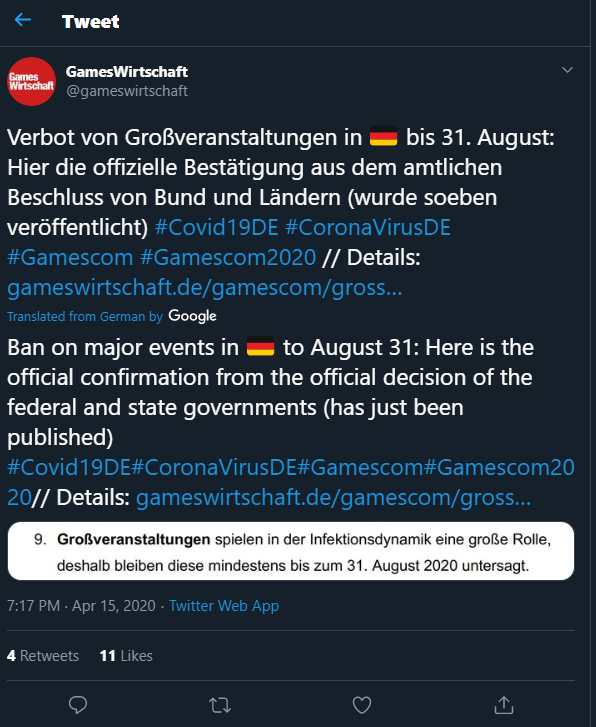 To będzie naprawdę dziwny rok, ze względu na koronawirusa. Dziwny, bo praktycznie bez żadnych dużych imprez targowych i konferencji. Niemiecki rząd zdecydował o przedłużeniu zakazu dużych imprez masowych do 31 sierpnia. Uderza to oczywiście w Gamescom, który miał odbyć się w Kolonii między 25 a 29 sierpnia.