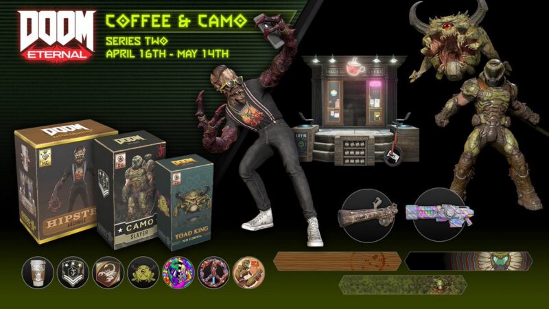 W DOOM Eternal rozpoczęła się nowa seria o nazwie “KAWA I KAMUFLAŻ”, wprowadza ona zupełnie nową kolekcję kosmetycznych drobiazgów do odblokowania.