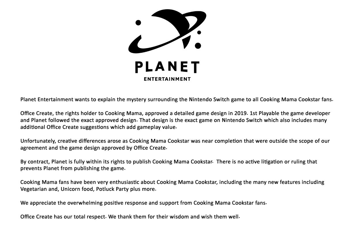 W sierpniu 2018 roku Office Create udzieliło licencji Planet Entertainment na wyprodukowanie gry Cooking Mama: Cookstar na Nintendo Switch. Niestety, jakość wersji testowych nie spełniała standardów, które my oraz nasi klienci oczekujemy. Office Create odrzuciło wiele propozycji [funkcji], które mogły wpłynąć na całą zawartość gry oraz przyjemność z grania. Planet Entertainment pomimo zobligowania do poprawy tytułu i wysłania go do akceptacji, postanowiło samodzielnie wydać Cooking Mama: Cookstar.