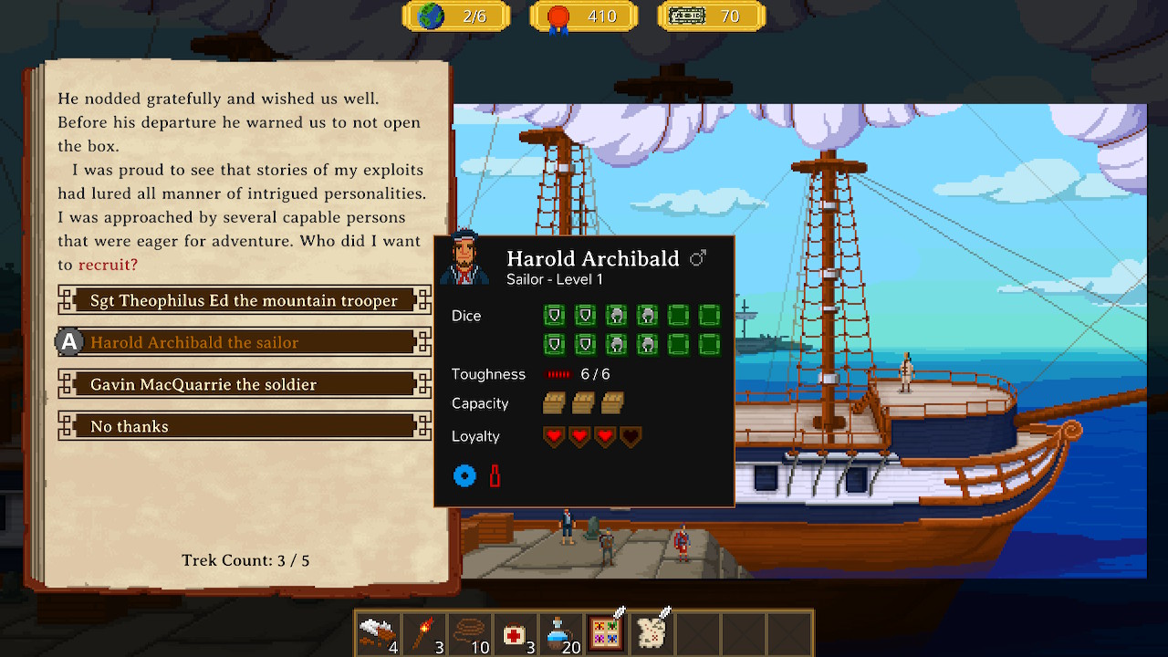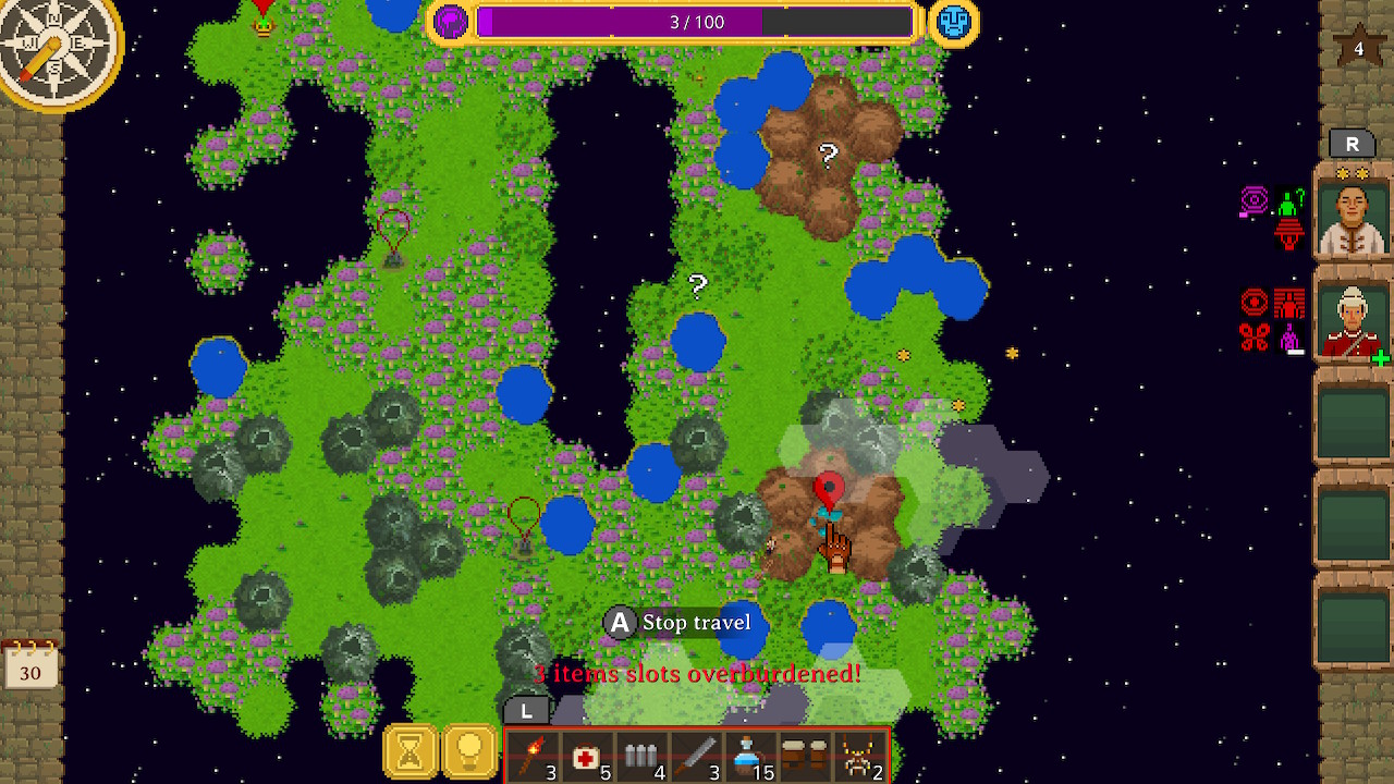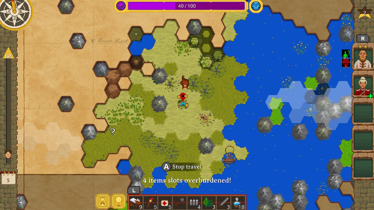 Rozgrywka jest najlepszym przysmakiem w Curious Expedition. Twórcy chcieli jak najbardziej oddać ducha niebezpiecznych wypraw i muszę przyznać, że wyszło im to bardzo dobrze. Mamy tutaj wyznacznik zdrowia psychicznego naszego zespołu, od którego zależy całe powodzenie naszej ekspedycji. Musimy na niego uważać wraz z kolejnymi ruchami oraz uzupełniać go, jedząc zebrane zapasy, czy odpoczywając. Oczywiście, bez zdrowia psychicznego da radę wędrować, jednak taka “wędrówka” nie trwa zbyt długo. 😉