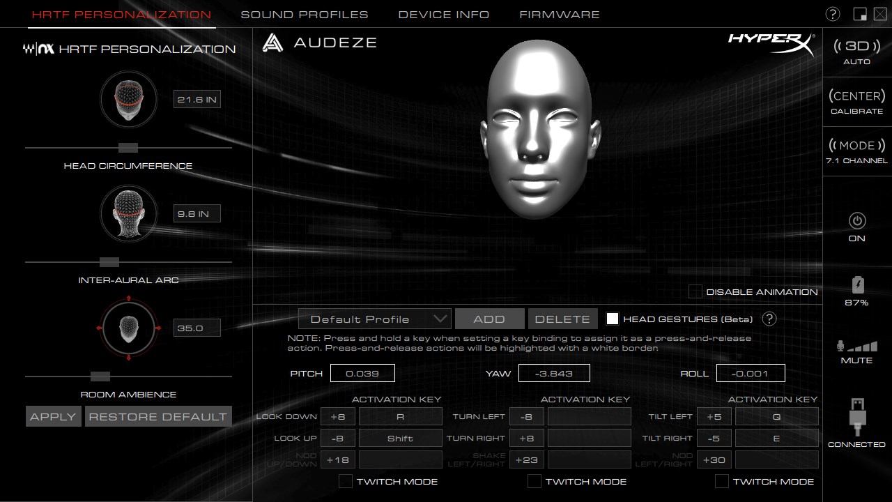 Czy kiedyś wyobrażaliście sobie, że w grach – co prawda tylko na PC – moglibyście wydawać komendy za pomocą… ruchów głowy? Słuchawki HyperX Cloud Orbit S dzięki wspominanej technologi Waves Nx wam to umożliwią. W aplikacji HyperX Orbit S do konkretnego wychylenia, odchylenia lub obrotu głowy przypisujemy odpowiedni klawisz. Powiedzmy, że do obniżenia głowy o -10 stopni ustawiamy przycisk R, który odpowiada najczęściej za przeładowanie broni, a do podniesienia głowy o +10 stopni ustawiamy shift, czy czyli szybki bieg. Od teraz, przechylając głowę w dół nastąpi aktywacja klawisza R, a tym samym nasza postać przeładuje broń. Oczywiście w trakcie gry ciężko utrzymać głowę w miejscu, więc trzeba poświęcić sporo czasu na naukę i przystosowanie się do technologi HEAD GESTURES. Warto dodać, że funkcjonalność tę można wykorzystać jako alternatywną metodę sterowania w przypadku graczy z ograniczeniami.