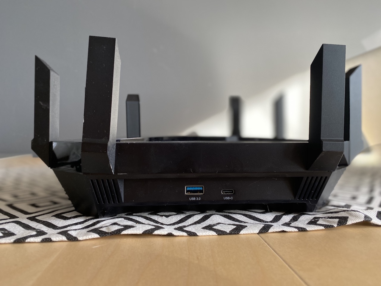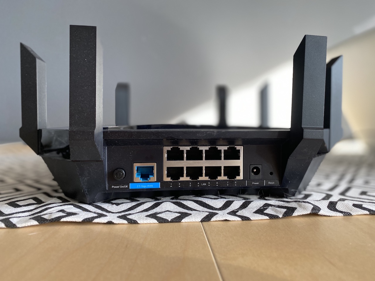Zacznijmy od samego wyglądu urządzenia. Jest ono oczywiście dość sporych rozmiarów, więc możecie mieć problem z umiejscowieniem go na półce. Na górze znajdziemy aż 8 anten, które służą do rozprowadzania sieci bezprzewodowej. Z tyłu znajdziemy aż 8 portów LAN, każdy o prędkości 1Gb/s. Obok nich dostępny jest port WAN o przepustowości 2.5Gb/s. Na jednym z boków urządzenia znajdują się dwa porty USB 3.0. Jeden z nich jest w standardzie C. Urządzenie wygląda elegancko i nie powinno szpecić nowoczesnego wystroju mieszkania. Zdecydowanie jest to urządzenie, na które zgodzą się inni domownicy.