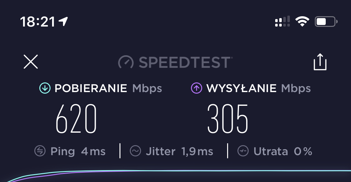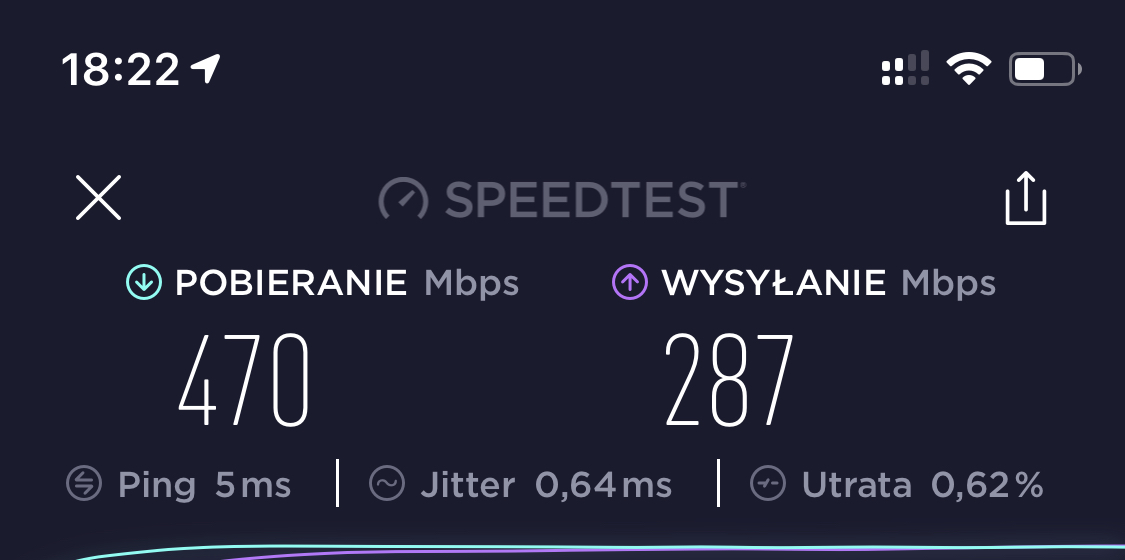 Router mam umiejscowiony w centralnym punkcie mieszkania, dzięki czemu zasięg rozchodzi się równomiernie. Testy wykonywałem tuż przy samym urządzeniu jak i w najbardziej oddalonym od routera rogu mieszkania. Poniżej Speed testy wykonane przy samym urządzeniu dla odpowiednio iPhone 11 i 11 Pro.
