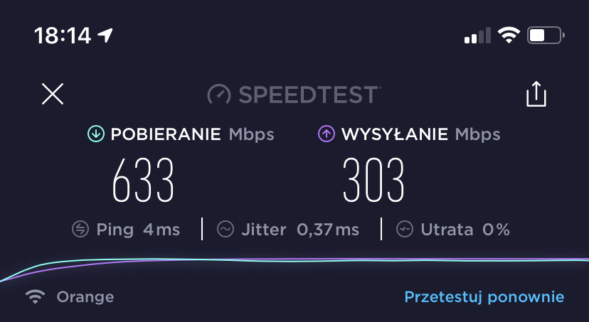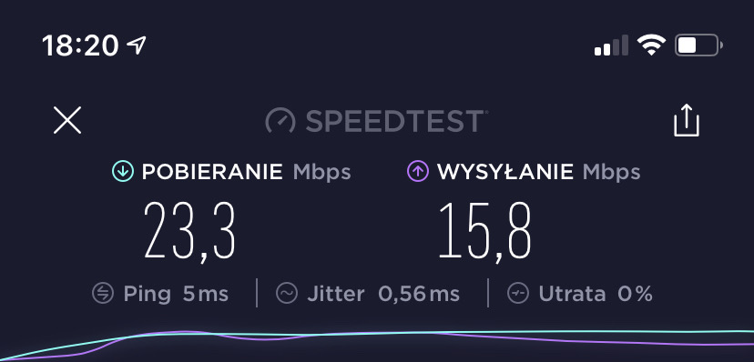 Jak widać wyniki są więcej niż zadowalające. Prędkość internetu kilka metrów od routera za dwoma ścianami wyglądają następująco.