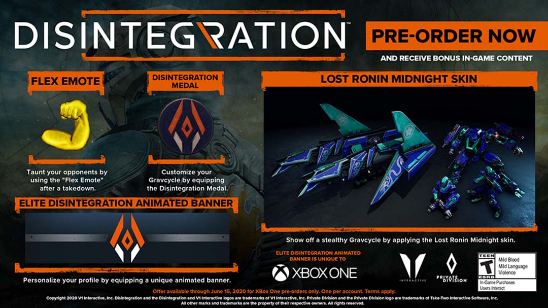 Wydawca Private Division i developer V1 Interactive ogłosili datę premiery Disintegration. Gra pojawi się na PS4, Xbox One i PC [Steam] 16 czerwca w wersji cyfrowej. Wszyscy gracze którzy dokonali zakupu w przedsprzedaży, otrzymają bonusowe elementy kosmetyczne (skórka dla ekipy, emotka, ozdoba gravicykla i specjalny animowany baner inny dla każdej platformy). Dostaliśmy także nowy zwiastun.