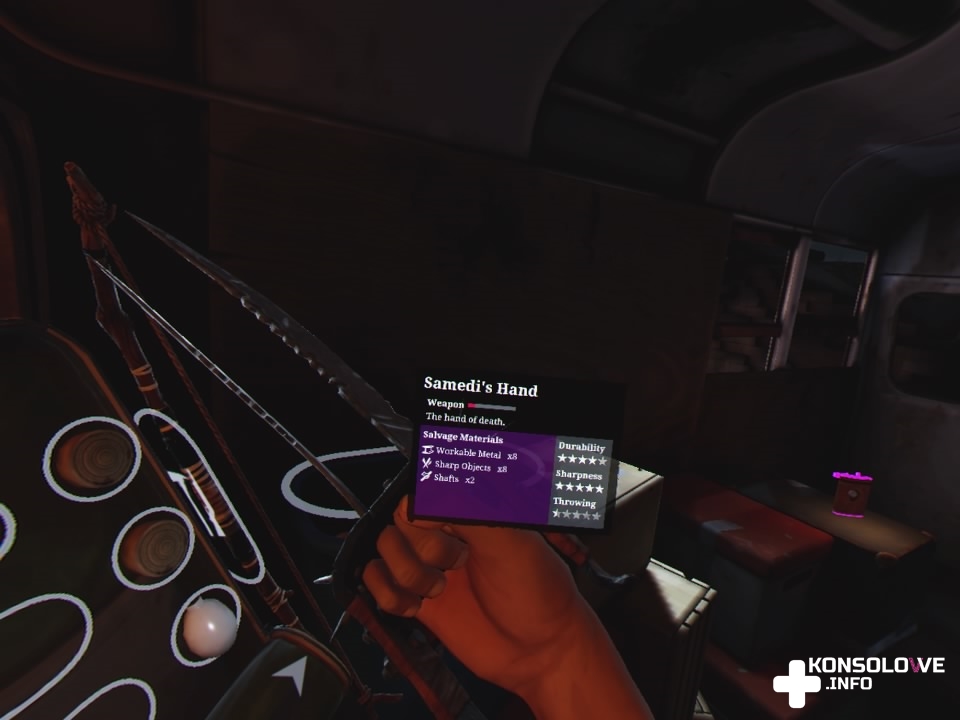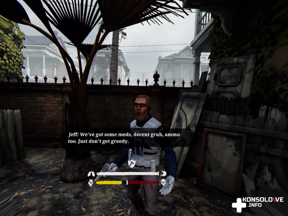 Jednym z powodów jest dodanie do gry paska kondycji. Wykonywanie czynności wymagających użycia mięśni pociąga za sobą zużywanie tego wskaźnika. Pasek maleje więc podczas wspinaczki, walki bronią wręcz, odpychania od siebie napierających na nas nieumarłych, czy w trakcie biegania. Nie powinno dziwić, że musimy faktycznie wykonać odpowiedni ruch, by naszą postać go odwzorowała. I tak chwytamy rurę ręka za ręką i wpinamy się. Bierzemy zamach i wyprowadzamy cios lub wbijamy nóż w czaszkę przeciwnika po wykonaniu odpowiedniego ruchu, by i nasz bohater go wykonał. Mało tego, możemy chwycić broń oburącz, by atakować silniej i bardziej precyzyjnie. Oprócz tego możemy się leczyć – spożywanie określonych posiłków znajdowanych w szafkach zapewni nam wzrost bądź spadek zdrowia lub kondycji. Nieodzowne są też bandaże – realnie owijając jedną ręką drugą możemy zabandażować kończynę, a sięgając za siebie na plecy możemy ściągnąć plecak, do którego możemy wkładać różne znaleziska. Recenzowana produkcja zdecydowanie stoi interakcjami i wchodzenie w nie sprawia ogromną przyjemność.