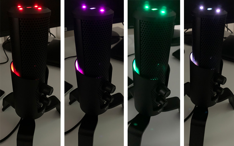 Zacznijmy od strony wizualnej. Nie wiem, czy obowiązują jakieś standardy jeśli chodzi o design mikrofonów, ale w przypadku FYRU nic nie odbiega od normy. W pudełku mamy trójnożną podstawę, kabel do połączenia mikrofonu z komputerem, śrubę mocującą i sam mikrofon. Wszystko jest czarne, metalowe i dość ciężkie. na froncie mikrofonu znajdziemy dwa pokrętła głośności – dla samego mikrofonu i głośników, gniazdo Jack do podpięcia słuchawek i to tyle. Na górze znajdują się cztery diody i przycisk Mode, dzięki któremu możemy ustawić sposób nagrywania dźwięku. Mikrofon do połowy swojej wysokości schowany jest w gustownym, metalowym kołnierzu, który kryje dość fajny patent związany z wyglądem całości. W kołnierzu znajduje się podświetlenie LED, które świeci kolorami RGB, podświetlając mikrofon. Dostępne jest 5 kolorów, które można dostosować według własnych preferencji (pulsowanie, stałe podświetlenie, tryb ECO).