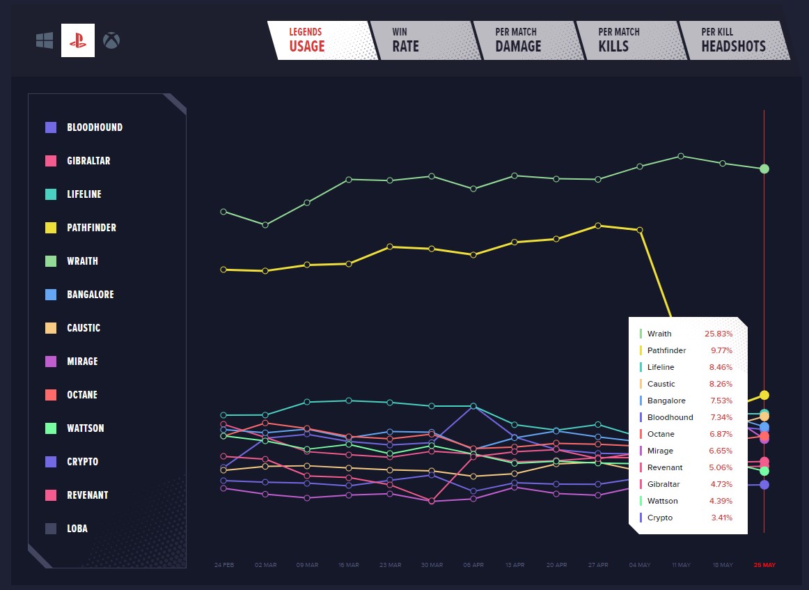 Apex Legends, to jedna z najpopularniejszych gier typu Battle Royal na konsolach, czy kiedyś zastanawialiście się, która z Legend jest najchętniej wybierana? Możecie to sprawdzić na stronie DreamTeam.gg która szczegółowo podaje statystki z kilku popularnych gier online.