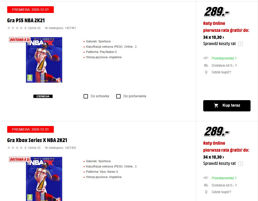 Grę NBA 2K21 w wydaniach standardowym oraz Mamba Forever Edition, zarówno na konsole obecnej i nowej generacji można już zamawiać w polskich sklepach internetowych z grami, ceny wydania standardowego na PlayStation 5 oraz Xbox Series X wahają się od 279 do 289 zł – m.in w Muve.pl, X-kom, czy Media Markt.