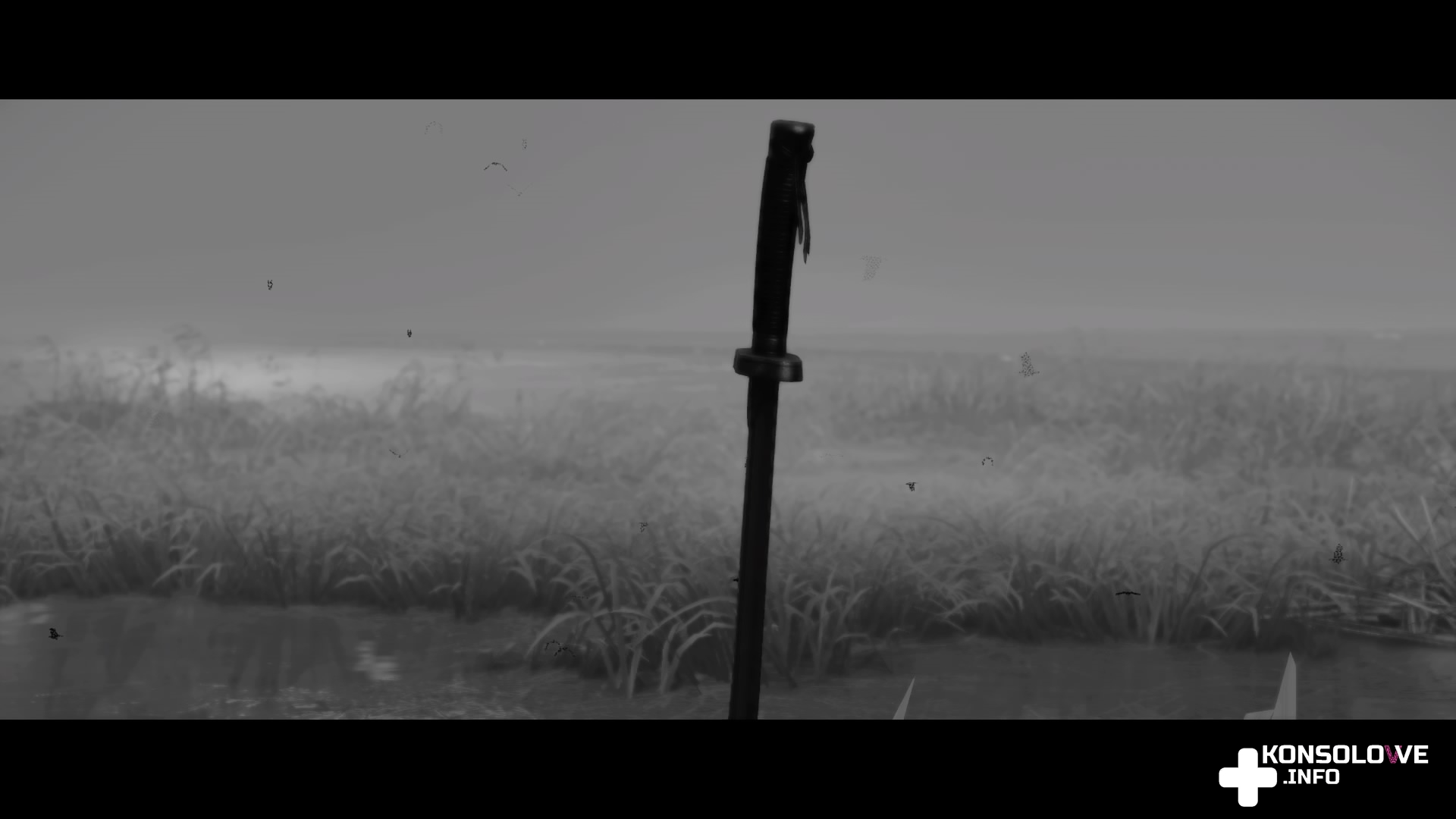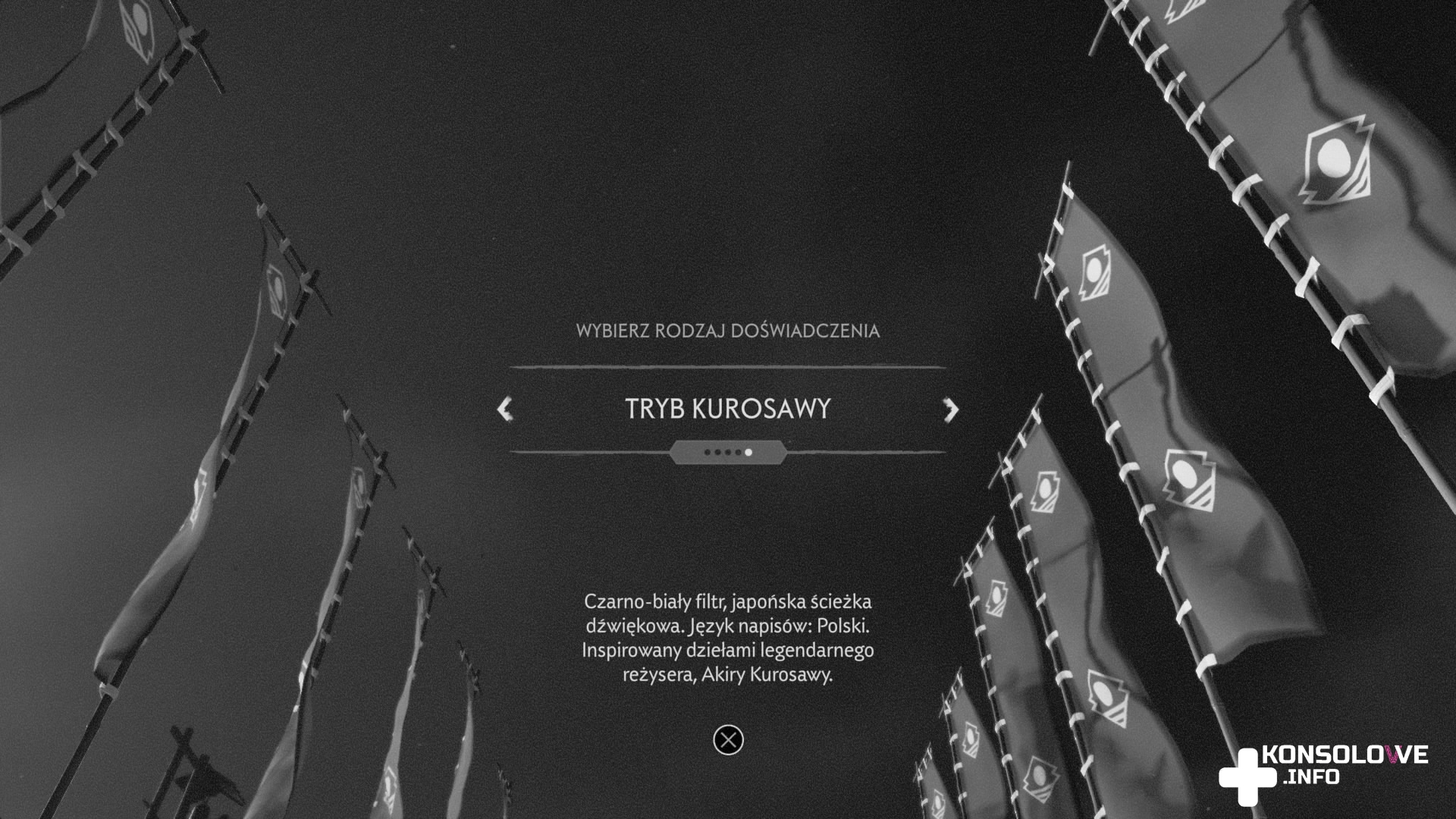 Nie bez powodu przywołałem wcześniej film legendy japońskiego kina – Akiro Kurosawy. W Ghost of Tsushima znajdziemy bowiem specjalny Tryb Kurosawy. Decydując się na grę w nim, otrzymamy dostęp do pełnej zawartości produkcji. To tylko i aż filtr dźwiękowy i wizualny. Włączając go, będziemy widzieli obraz w odcieniach czerni i bieli, a głosy postaci zostaną ustawione na japońskie. Nadal mamy oczywiście wpływ na wariant językowy napisów, toteż nie ma problemu z graniem z japońskim dubbingiem (mimo że ruch ust postaci jest zsynchronizowany z angielską wersją gry) oraz angielskimi lub polskimi napisami, zależenie od naszych preferencji. Tryb Kurosawy charakteryzuje się jeszcze jednym smaczkiem – przez ekran co chwilę będą przeskakiwały pasy, potęgując wrażenie oglądania starego filmu i efektu wywoływanego przez taśmy filmowe. Dodajmy do tego jeszcze długie, pełne napięcia ujęcia, a dostaniemy idealne przeniesienie filmów Kurosawy na poletko gier.