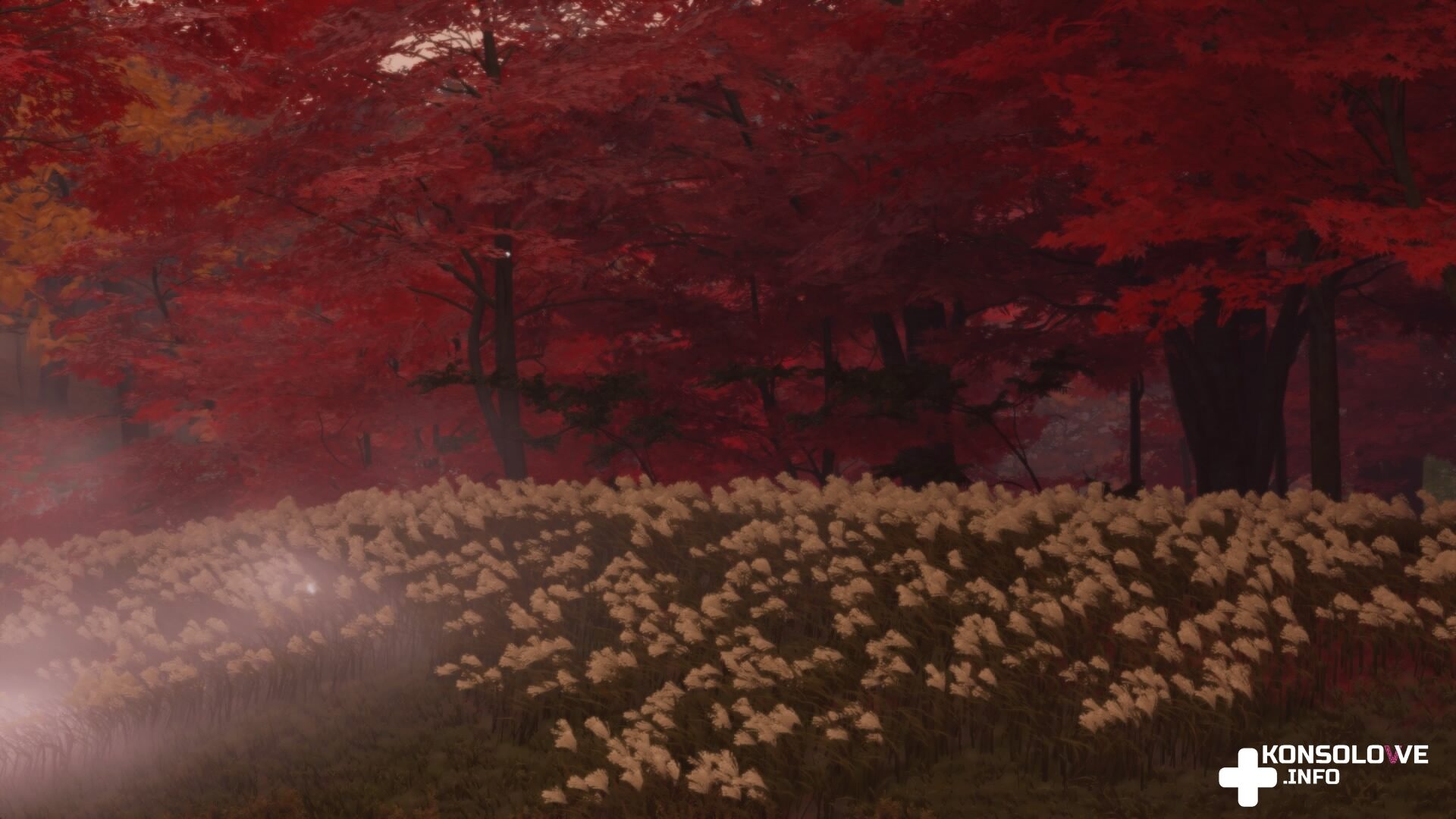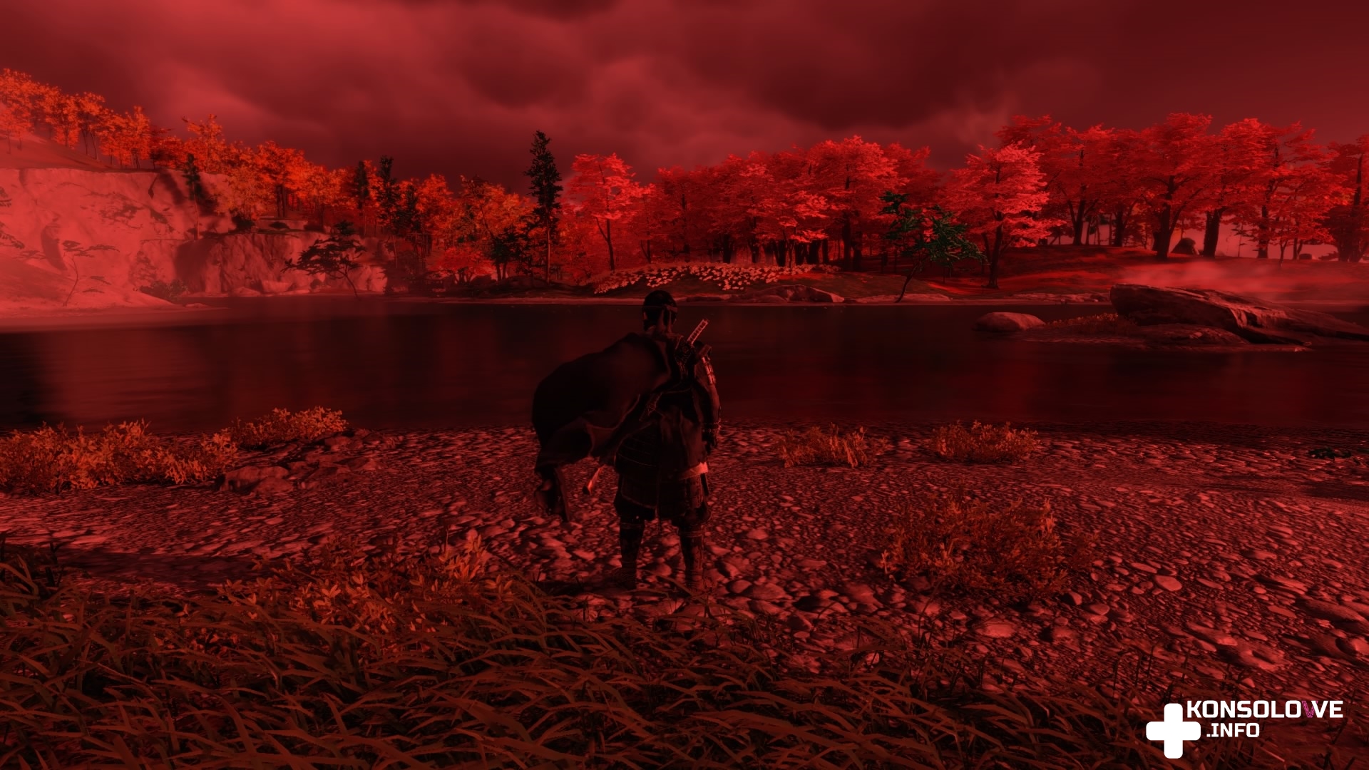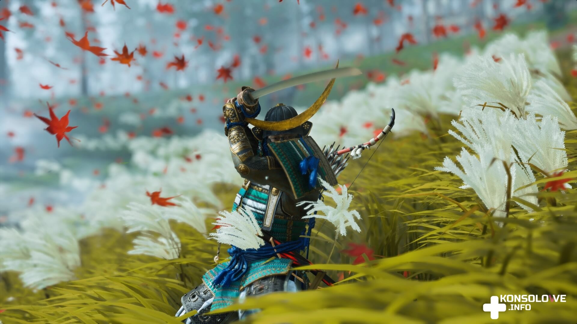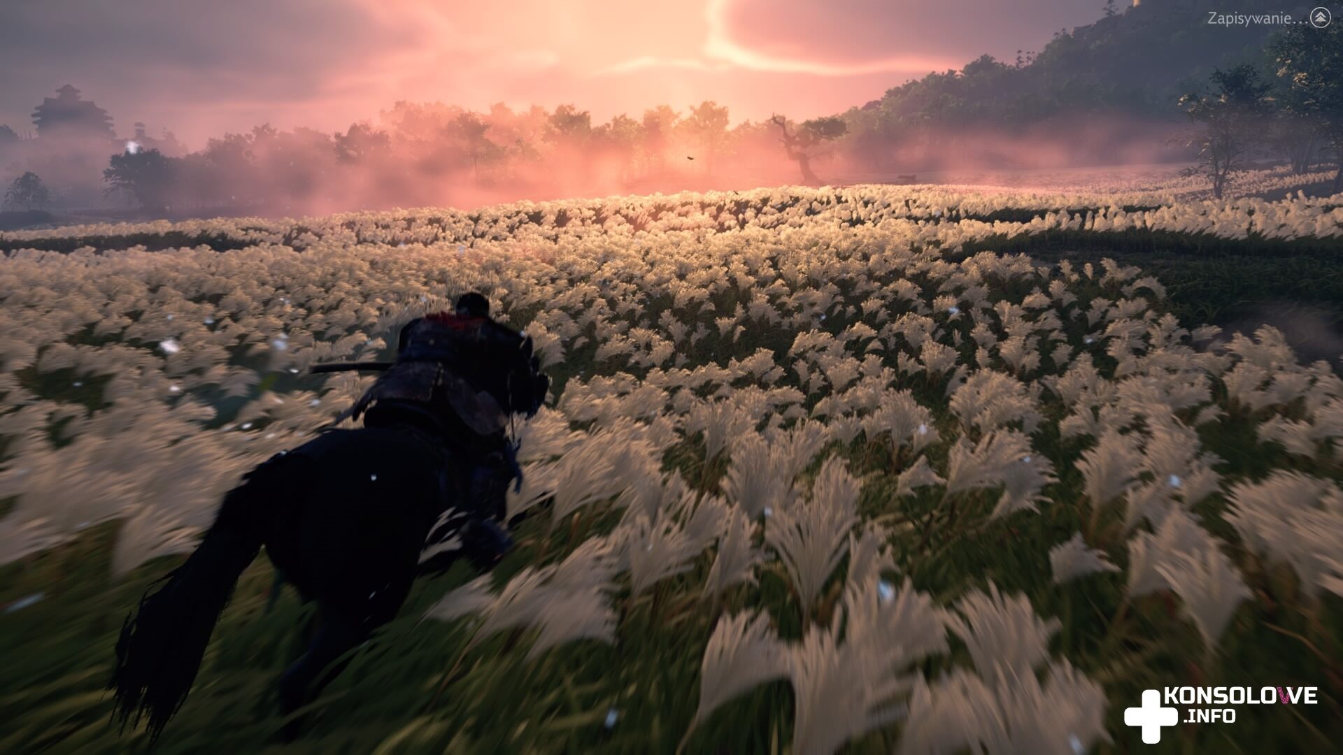 Nie odmawiając Trybowi Kurosawy ogromnego wpływu na immersję, warto za pierwszym razem przejść Ghost of Tsushima, nie aktywując czarno-białego ekranu. Powód jest bardzo prosty: Ghost of Tsushima wygląda fantastycznie i szkoda byłoby nie dostrzec wszystkich efektów świetlnych. Cuszima jest często wręcz zanurzona w zachodach i wschodach słońca, czy różnego rodzaju barwnej faunie i florze. Przemierzając japońską wyspę, niewątpliwie nierzadko będziecie mieli chęć przystanąć na chwilę i uchwycić piękno świata. Z pomocą przychodzi tu niezwykle rozbudowany Tryb Fotograficzny. Znajdziemy w nim oczywiście standardową zmianę miny głównego bohatera, ustawianie głębi ostrości, czy odległości ogniskowania, ale nie to jest najlepszym, co on zapewnia w recenzowanej grze. Tryb Fotograficzny pozwala wpłynąć na wiele elementów sceny. Możemy ustalić, jaki (i czy w ogóle) ma być rodzaj spadających liści, ich zagęszczenie, wybrać filtr kolorystyczny, czy zadecydować o kierunku wiatru. Mało tego, oddano nam możliwość zadecydowania o tym, czy ujęcie ma być statyczne, czy dynamiczne – a więc, czy mają być widoczne ruchy trawy i powiewanie naszego ubioru. To tylko niektóre z opcji, które są dostępne w tym trybie. Pozwala on stworzyć niesamowicie dopracowane i ładne ujęcia. Zerknijcie tylko na poniższe zrzuty ekranu. Bynajmniej nie mam się za mistrza fotografii, a mimo tego opisywany tryb (aktywowany przez naciśnięcie prawego kierunku na D-Padzie) potrafi wykreować bardzo klimatyczne ujęcia.