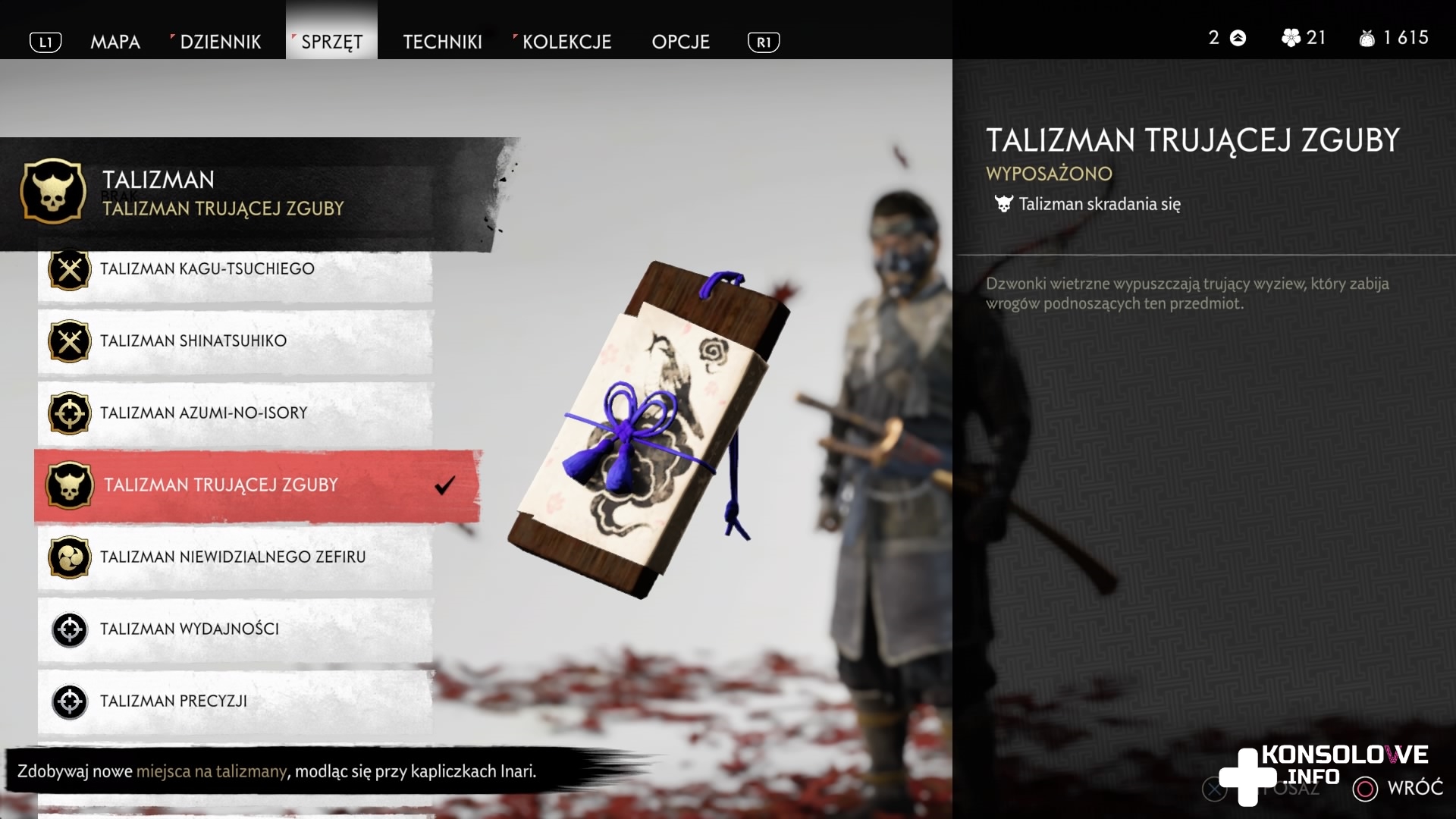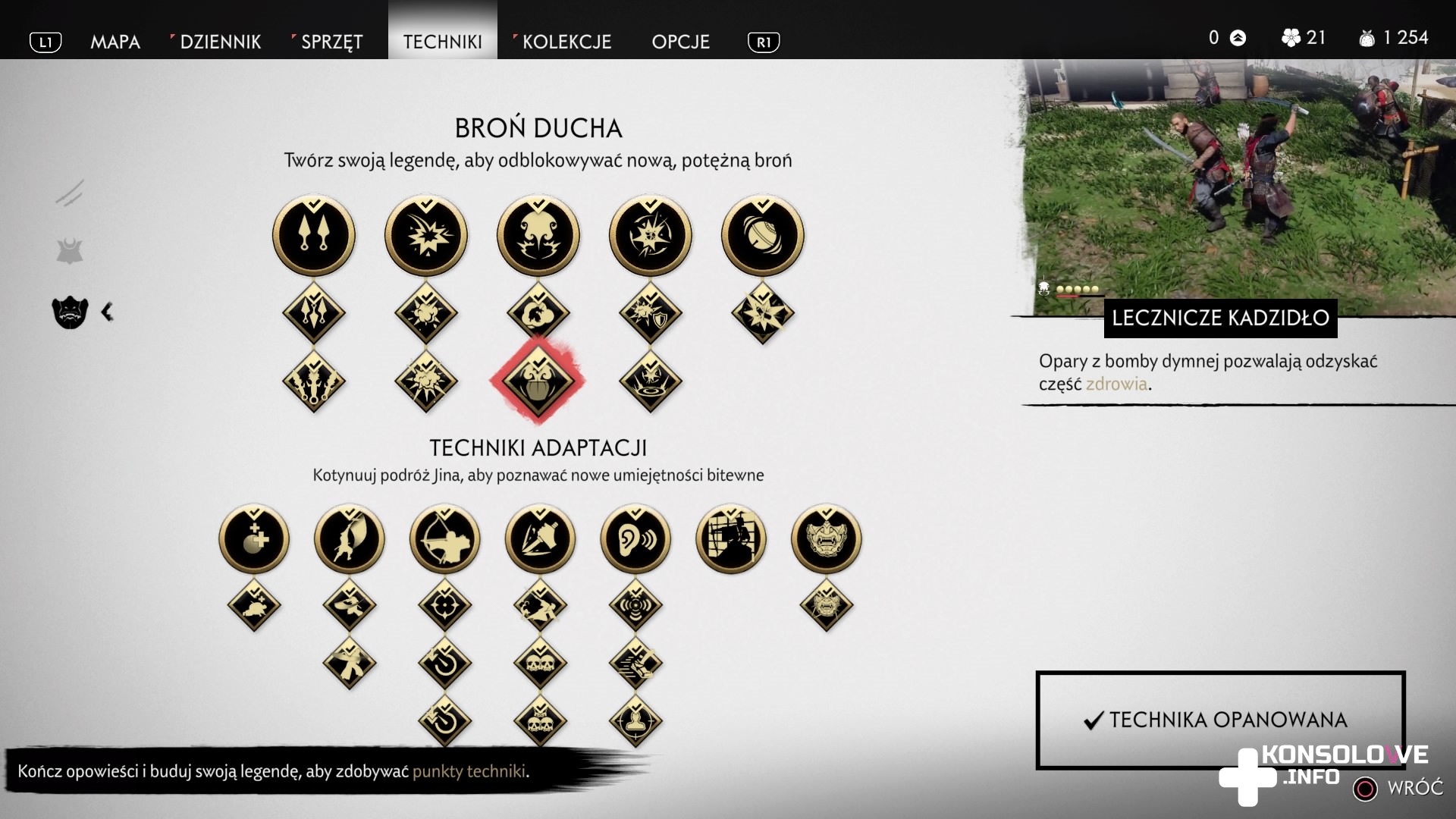 Jak przystało na nową grę, w Ghost of Tsushima nie mogło zabraknąć personalizacji postaci i rozwijania umiejętności. Wykonując misje (główne i poboczne) oraz biorąc udział w losowo generowanych spotkaniach, czy starciach będziemy mogli pozyskać nowe przedmioty i punkty techniki oraz zwiększyć swoją legendę samuraja. Zdobywane poziomy techniki wydajemy na rozwijanie zdolności Jina. Każdy znajdzie tu coś dla siebie. Zwolennicy skradania niewątpliwie zainwestują w możliwość wykonywania trzech następujących po sobie zabójstw po cichu, natomiast miłośnicy otwartej walki powinni rozważyć zakupienie regeneracji zdrowia po wykonaniu perfekcyjnego kontrataku. Zdecydowanie jest na co wydawać zarabiane punkty i na pewno nie będziecie mieli problemu ze znalezieniem następnego celu w menu ulepszania bohatera.