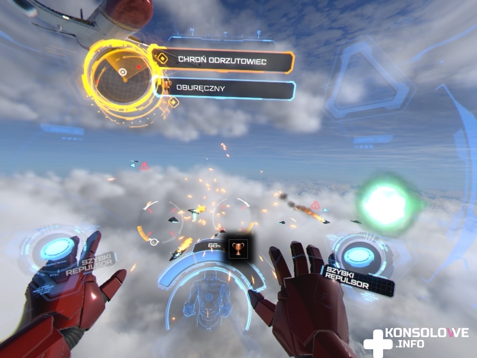 Iron Man VR to oczywiście gra korzystająca z gogli wirtualnej rzeczywistości od Sony. Warto więc opisać sposób zaimplementowania VR i sterowanie w recenzowanej produkcji. Na szczęście Camouflaj stanęło na wysokości zadania i stworzyło niesamowicie intuicyjny model poruszania się oraz walki. Wszystkie czynności, które wykonujemy odbywają się naturalnie i nie minie wiele czasu, a będziecie sprawnie lawirować między skałami i unikać ognia przeciwników. Do rozgrywki niezbędne są dwa kontrolery PlayStation Move i szczerze nie wyobrażam sobie alternatywnego sposobu sterowania. Opuszczając dłonie z tymi kontrolerami wzdłuż nóg, wychylając dłonie do tyłu i naciskając spusty na obu kontrolerach, będziemy lecieli w kierunku wskazywanym przez naszą głowę. Nie może oczywiście zabraknąć możliwości wykorzystywania w walce ikonicznych broni Iron Mana – repulsorów. Aby strzelać z tych zamontowanych na dłoniach broni, należy skierować kontroler PlayStation Move, odwracając dzierżącą go dłoń w stronę przeciwnika i nacisnąć przycisk ataku. Możemy też wykorzystywać dodatkowe pociski montowane na wierzchniej części dłoni – używanie ich jest analogiczne. Kierujemy Movy wierzchem do góry w stronę przeciwnika i wciskamy przycisk ataku. Oprócz tego możemy korzystać z pięści – naciśnięcie stosownego przycisku na każdym z kontrolerów zaciśnie naszą dłoń w pięść, którą następnie możemy uderzyć namierzonego oponenta. Możemy też wycelować nią pod nas, aby pomknąć w kierunku ziemi i wylądować w stylu Iron Mana, jednocześnie zadając obrażenia obszarowe. Najlepsze w tym wszystkim jest to, że walka i latanie są niesamowicie intuicyjne, naturalne. Ta gra naprawdę pozwala nam wcielić się w tytułowego bohatera Marvela.