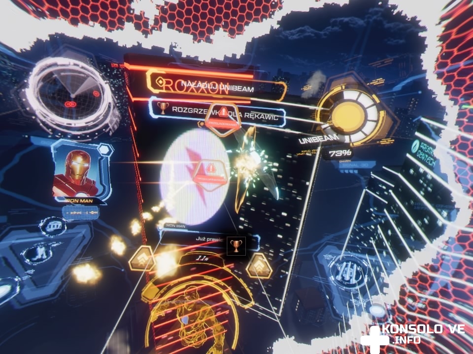 Iron Man VR pozwala nam także na dostosowanie wyposażenia, z jakiego korzystamy. Każda misja, w której weźmiemy udział zostaje na końcu oceniona na podstawie wybranego poziomu trudności i tego, jak sobie poradziliśmy w starciu z dronami. Zdobywamy odpowiednią do zdobytej noty liczbę punktów rozwoju, które następnie możemy przeznaczyć na spersonalizowanie zestawu wyposażenia. Możemy zamontować alternatywne bronie – działające jak strzelba, czy granatnik albo rakiety namierzające oponentów. Mamy też wpływ na przyspieszenie maksymalne oraz prędkość odnawiania się specjalnych ataków, czy na przykład obrażenia, jakie są zadawane przez najmocniejszy atak w grze – Unibeam – potężny strumień płynący z reaktora na piersi Iron Mana. Jednak dostosowanie bohatera nie kończy się na wyborze broni. Możemy też zdecydować się na jeden z 10 dostępnych wariantów kombinezonu. Odblokowujemy je za pozbywanie się przeciwników w określony sposób, ale większość z tych wyzwań nie powinna stanowić problemu. Bardzo spodobało mi się to, że nie jesteśmy ograniczeni tylko do jednego wyglądu pancerza i możemy swobodnie przełączać się między takimi stylami jak na przykład Żelazny Patriota, czy Płynna Lawa. Jest to tym przyjemniejsze, że widzimy całe ręce, latając jako Iron Man. Dzieło Camouflaj zdecydowanie korzysta dzięki temu na realizmie.