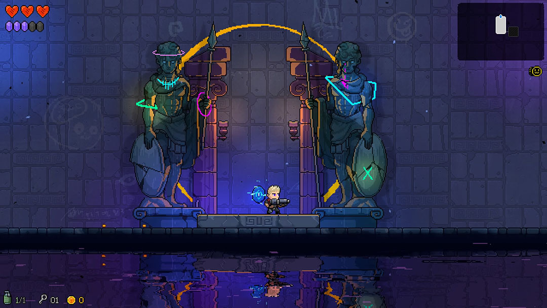 Udźwiękowienie stoi na naprawdę wysokim poziomie. Muzyka w tle totalnie nie przeszkadza, każda broń brzmi świetnie. Nie można się do niczego przyczepić. Wizualnie – jest kolorowo, neonowo i pixelowo. Nie jestem fanem pixelartu (i jest to delikatnie powiedziane), ale Neon Abyss mnie naprawdę przekonuje. Zwłaszcza, że twórcy zawarli sporo dodatkowych smaczków wizualnych, takich jak rozbryzgi krwi, spore wybuchy, czy ślady po wybuchach na ścianach. To naprawdę robi robotę. No i same bronie i efekty wszystkich wzmocnień wyglądają naprawdę obłędnie (np tarcza wokół postaci z różowych nut). Kolor wylewa się wręcz z ekranu!
