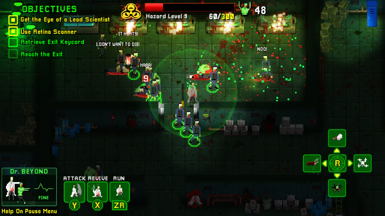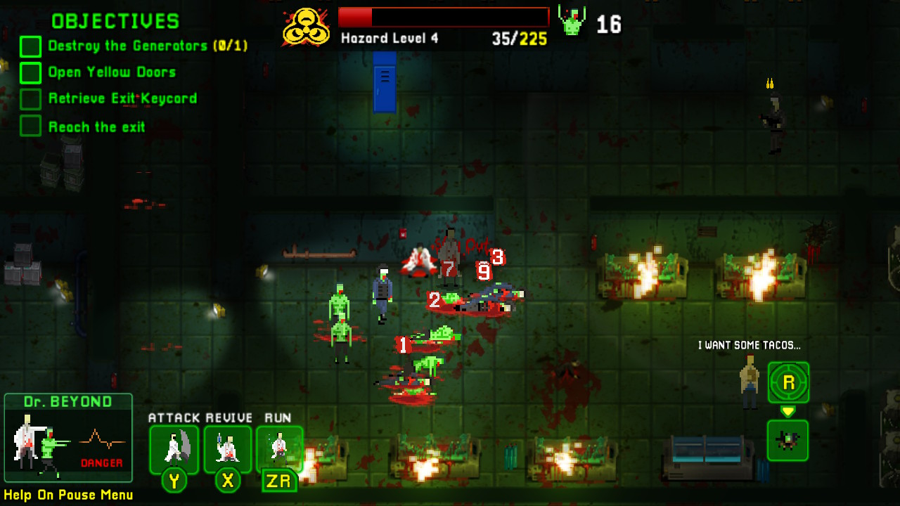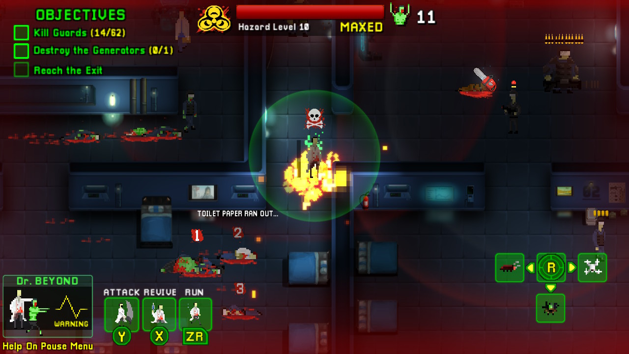 Gacz do walki z przeciwnikiem może jeszcze wykorzystać 5 gadżetów znajdywanych w świecie gry. Pierwszym z nich jest gaz, dzięki którym mamy jeszcze jedną szansę na dokończenie poziomu, kiedy polegniemy w walce. Pozostałe gadżety to drony, dzięki którymi utorujemy drogę naszym podwładnym. Mamy tutaj maszynki do zdalnego unieruchamiania przeciwników, wybudzania zombie do życia oraz drona wybuchowego i zarażającego. Muszę przyznać, w pełni wystarczający wybór, tutaj każdy z gadżetów jest niemalże od razu wykorzystywany, jak tylko pojawi się w naszym ekwipunku. Informację o naszym stanie zdrowia znajdziemy w lewym dolnym rogu, a uzupełniać jego zapas możemy apteczkami poukrywanymi na mapie. Co ciekawe, zawsze leczą do maksimum. Na mapie możemy znaleźć również specjalną strzykawkę, która pozwala nam na zarażanie do 3 trupów na raz. Na koniec, warto wspomnieć o pile mechanicznej, dzięki której wyżynamy kolejne oddziały przeciwników niczym Doom Guy.
