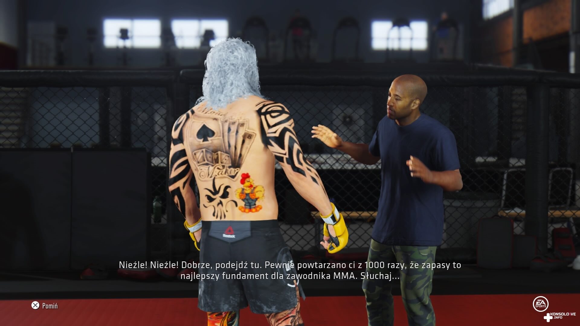 Rozgrywkę w UFC 4 rozpoczniemy od stworzenia własnego zawodnika. Do naszej dyspozycji oddano obszerny edytor postaci, w którym możemy wybrać jedną z kilkudziesięciu głów. Oprócz tego zadecydujemy również o fryzurze naszej postaci i zaroście, a także wytatuujemy różne części jego ciała – nogi, ręce, plecy, tors. Gra oferuje sporo różnorodnych tatuaży i niewątpliwie każdy z Was znajdzie coś dla siebie – oczywiście jeśli nie chcecie, nie musicie ich przypisywać do swojego zawodnika. Ja jednak, jak widzicie na zrzutach, postawiłem na bardzo barwnego bohatera, a samo wybieranie miejsca, w którym ma się znaleźć tatuaż to prawdziwa przyjemność. Możemy wpłynąć na rozmiar projektu, a także jego przezroczystość i umiejscowienie na ciele. Nie ma najmniejszego problemu, aby swobodnie przesuwać podglądem tatuażu po plecach i zejść z nim na tors, aby wybrać optymalne miejsce. Edytor wyglądu postaci jest bardzo przystępny i pozwala wygodnie się poruszać, aby stworzyć swojego wymarzonego zawodnika. Naszą postać możemy też ubrać w różnego rodzaju i długości spodnie i koszulki, a także zdecydować się na akcesoria, takie jak kapelusze i czapki. Niestety, do odblokowania części elementów kosmetycznych będzie wymagana waluta zdobywana w grze. Jest ona przyznawana za zdobywanie kolejnych poziomów rozwoju oraz wykonywanie wyzwań, aczkolwiek są to zawsze bardzo niewielkie ilości. Nie powinno to jednak dziwić, bowiem gra zawiera mikrotransakcje. Na szczęście odblokowują one jedynie dostęp do elementów kosmetycznych i gra nie zawiera modelu pay to win, co jest sporym plusem.