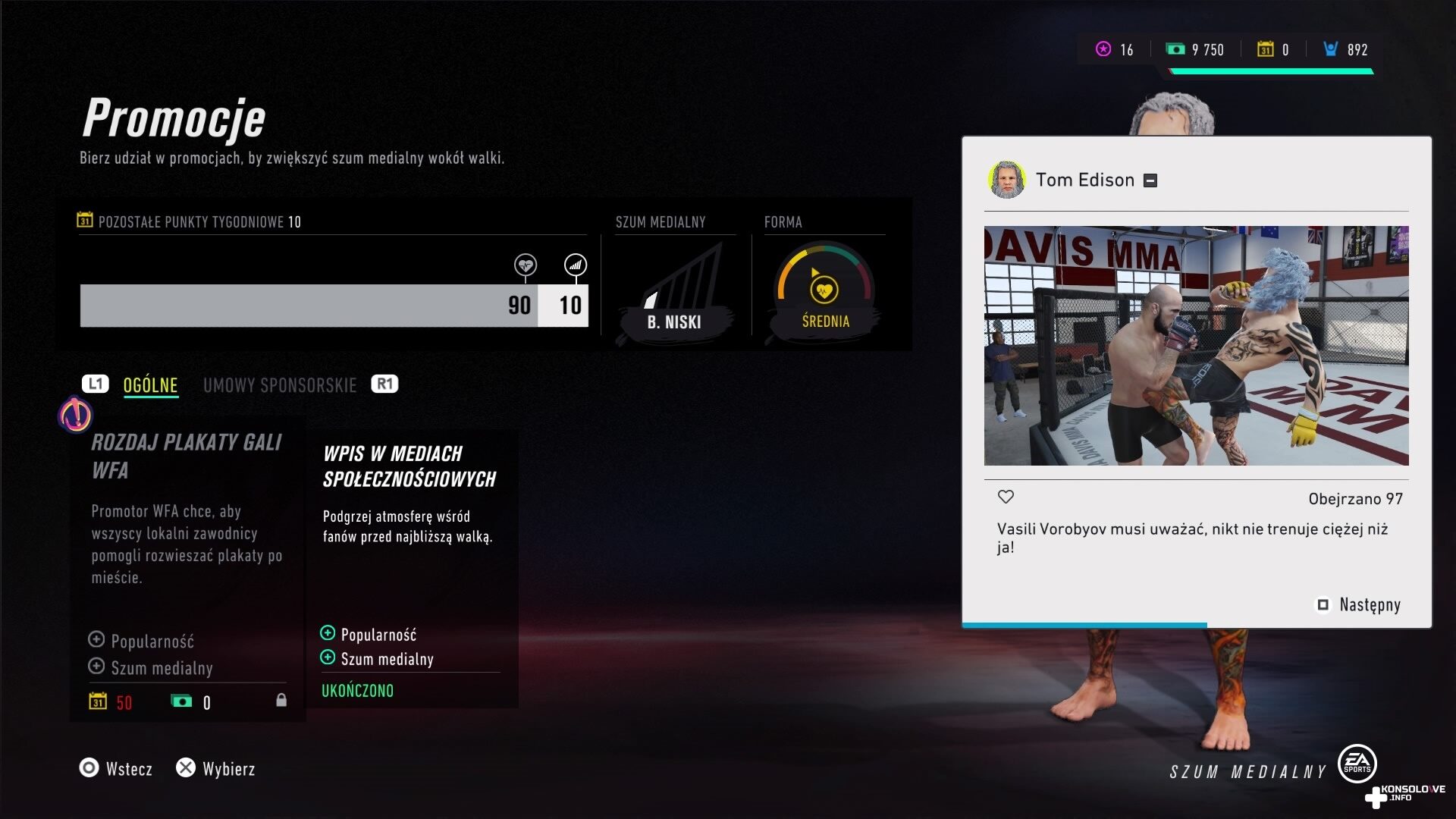 UFC 4 korzysta również z istotnego w dzisiejszych czasach elementu społecznościowego. Kariera zawiera moduł, w którym wyświetlane są przypominające Twittera wpisy. Odnoszą się one oczywiście do walk, w których wzięliśmy udział, ale możemy też wchodzić w interakcje z komentującymi wydarzenia zawodnikami. Nasze odpowiedzi pozwalają nam tworzyć swoich zagorzałych przeciwników lub przyjaciół. Zdecydowanie warto starać się utrzymać dobre kontakty z jak największą liczną zawodników – dzięki temu nauczą nas później nowych ciosów, oczywiście jeśli będziemy chcieli, za mniejszą kwotę. Bardzo spodobało mi się także wyświetlanie ujęć z naszych walk z fanowskich ujęć po podsumowaniu starcia. Widać, że ktoś nagrywał walkę telefonem i wstawił ją do internetu, poszukując wszechobecnych subskrypcji i polubień. Należy zaznaczyć, że my także nie jesteśmy obojętni na fanów. Im więcej osób śledzi nasze poczynania, tym większa szansa na to, że zauważy nas ważny sponsor i że będziemy mogli zarobić więcej podczas walki. Nie brakuje również korupcji – niektóre walki możemy sprzedać, a dodatkowo nasz zawodnik może doznać kontuzji, którą będzie musiał wyleczyć, jeśli będzie chciał być w dalszym ciągu tak efektywny jak wcześniej. Bardzo spodobało mi się też naturalne rozwijanie naszych zdolności – im częściej będziemy korzystać przykładowo z kopnięcia w głowę, tym mocniejsze będzie to uderzenie. Sensowne i bardzo przyjemne – mamy świadomość tego, że warto korzystać z preferowanych ciosów, aby zwiększać ich wydajność.