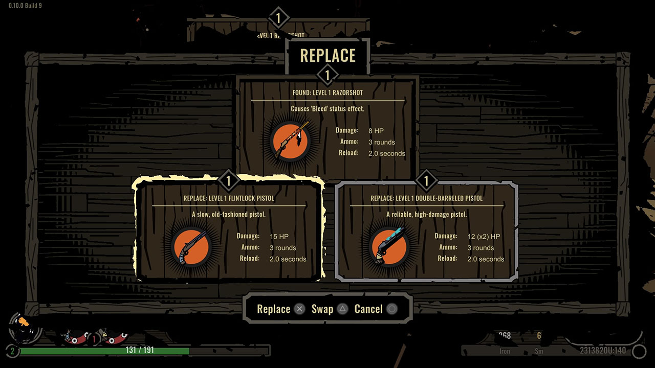 Mechanika rozgrywki to mieszanka gry typu Rogue-like i twin stickowej strzelaniny z wykorzystaniem osłon. Biegamy po Czyśćcu (który po naszej śmierci za każdym razem ma inny układ), korzystając z lewego drążka, prawym natomiast celujemy. L2 i R2 odpowiadają za strzelanie (tak – możemy mieć na raz 2 rodzaje broni), natomiast L1 i R1 odpowiadają za korzystanie z umiejętności. W każdej lokacji w której znajdują się przeciwnicy są też osłony, dzięki którym możemy uniknąć wrogiego ognia, oraz znacznie szybciej przeładować swoją broń. Osłony nie są wieczne i im dłużej jesteśmy pod ostrzałem tym szybciej osłona się rozpadnie, co wymusza na nas częstą zmianę pozycji. Dodatkowo bronie którymi dysponujemy (śrutówki, obrzyny, rewolwery, samoróbki, sztucery, siekiery) ma określoną liczbę strzałów bez przeładowania jak i zasięg. To daje nam możliwość dobrania sobie odpowiedniej dla nas strategii i stylu grania. Osobiście najlepiej grało mi się uzbrojonym w śrutówkę i pięciostrzałowego colta. Do tego arsenału dochodzą umiejętności (na przykład: szybsze przeładowanie broni kiedy nie chowamy się za osłoną, czy dynamit zadający obrażenia na pewnym obszarze), które posiadają cooldown i przedmioty służące do leczenia, wzmacniania i ochrony naszego rewolwerowca. Fakt – jest tego dość sporo i potrzeba dłuższego czasu, aby zapoznać się choćby z podstawowymi kombinacjami, ale kiedy już dojdziemy do ładu z całym systemem, zaczyna się robić naprawdę fajnie.