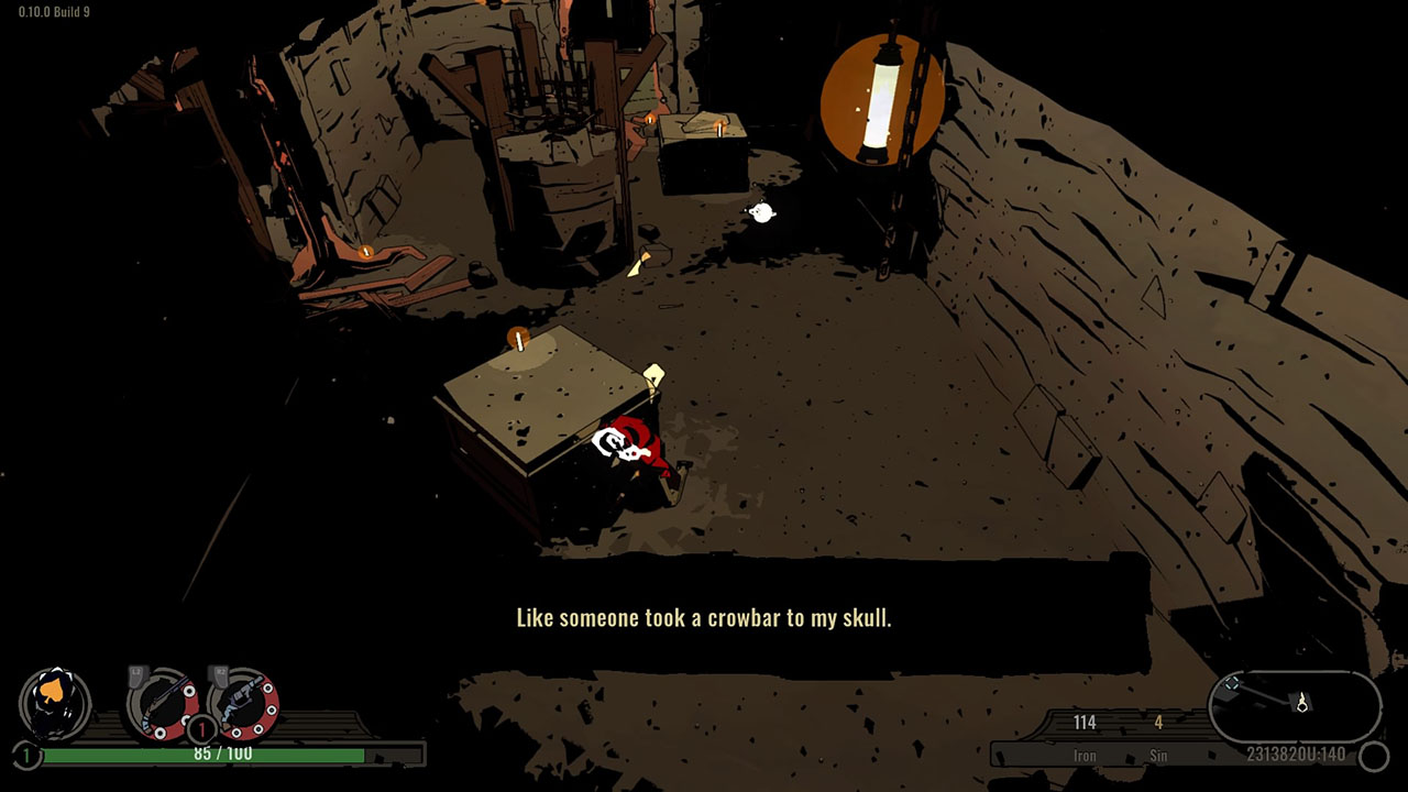 I właśnie – tutaj dochodzimy do minusów. Bo całość to naprawdę przyjemny tytuł, jednak nie pozbawiony wad. Cały czas grając w West of Dead miałem wrażenie, że to nie jest do końca skończony produkt. Sterowanie jest momentami strasznie toporne i potrafi zaciąć się w najmniej odpowiednim momencie. Dodatkowo – samouczki i menu jest niesamowicie … oszczędne, by nie powiedzieć surowe. Rozumiem intencję twórców, którzy wykorzystali UI w grze do opisania tego co robią poszczególne klawisze, jednak te pojawiają się dopiero gdy zbierzemy przedmiot który jest zmapowany pod odpowiedni klawisz. Brakuje mi nieco większego wytłumaczenia mechanik – powoduje to, że próg wejścia strasznie się zwiększa i może odrzucić sporą część graczy. Kolejnym przykładem niech będzie mechanika kupowania nowych przedmiotów. W grze zbieramy 2 waluty: żelazo i grzechy. Pierwszą wydajemy u kupców na nową broń, czy dodatkowe przedmioty. Drugą u Wiedźmy na różne specjalne i znacznie potężniejsze sprzęty niż te, które możemy spotkać u handlarzy. Jednak nikt nie tłumaczy nam, że przy każdej wizycie musimy wydać wszystkie dostępne grzechy. A także najlepiej wydawać je na konkretny przedmiot, bo otrzymujemy go dopiero po zapełnieniu paska przy każdym z nich. Jest to mechanika z Dead Cells o ile dobrze pamiętam, ale nie każdy gracz grał w Dead Cells i choć słowo wyjaśnienia byłoby tu na miejscu.
