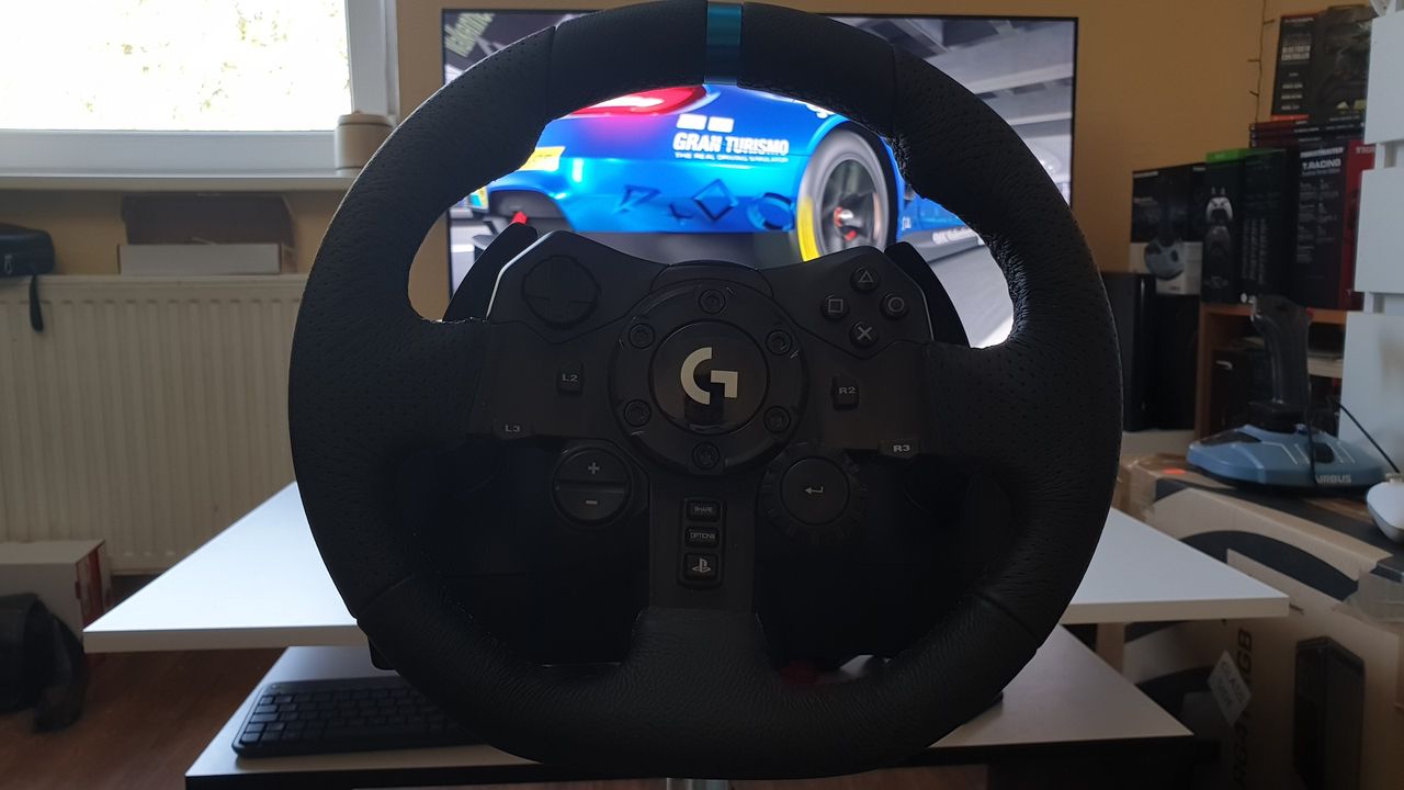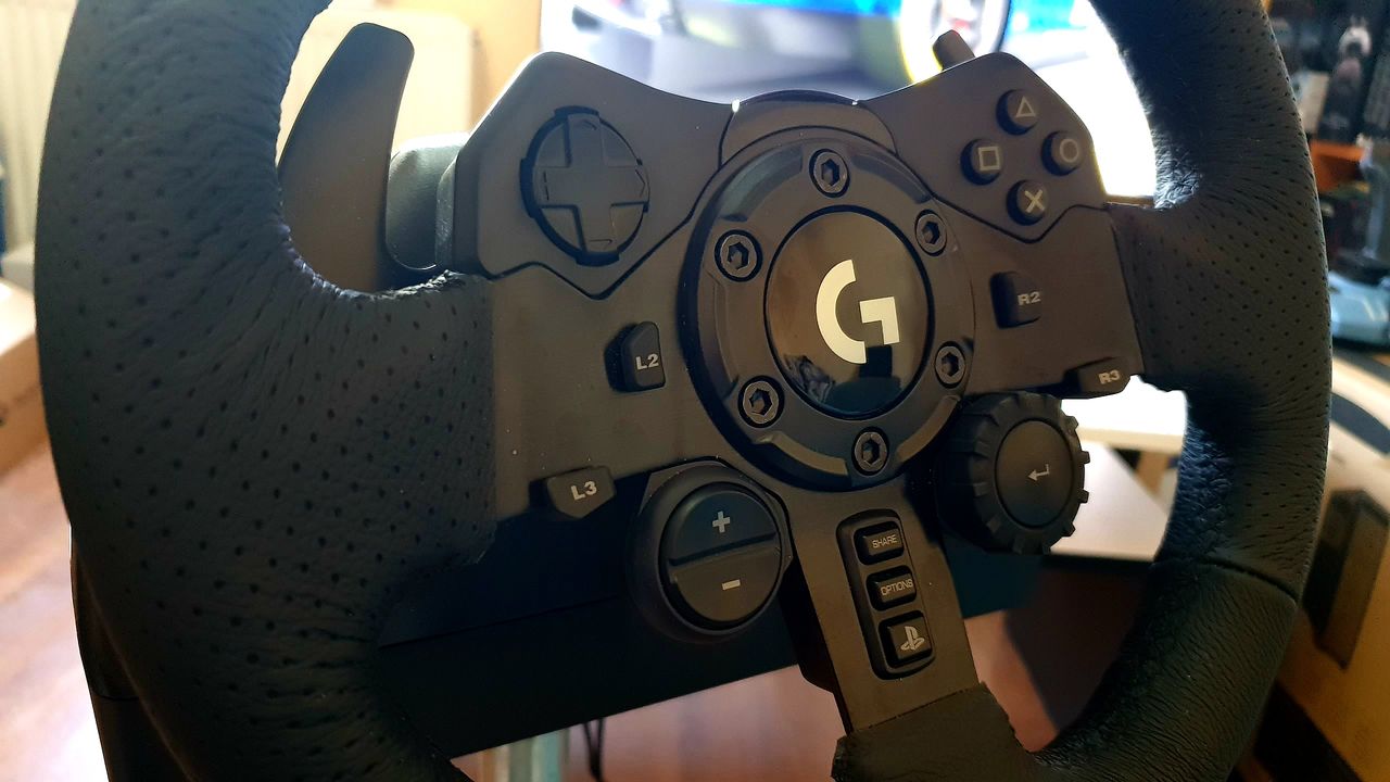 Obręcz G923 ma budowę kierownicy sportowego samochodu. Dolna jej cześć jest pozioma, a całość przypomina literę “D”. Jej obwód wynosi 27 cm. Kierownica jest pokryta wysokiej jakości ręcznie szytą skórą – przyczepność gołych dłoni jest bardzo dobra. Na środku kierownicy mamy duże logo Logitech G (G29 ma logo PlayStation). Po lewej stronie umieszczono D-Pad, a po prawej przyciski figurowe. Pod D-Padem mamy przyciski: L1 i L2, po drugiej stronie pod przyciskami figurowymi znajdziemy przyciski R1 i R2. Pod logiem Logitech G, na południowej części kolumny kierownicy, która jest wykonana z aluminium mamy trzy przyciski: Share, Options i PS Button. Nad znaczkiem PlayStation mamy mały wyświetlacz, który informuje nas o obrotach silnika. Działa prawidłowo z większością gier, które obsługuje ta kierownica. Dodatkowo mamy jeszcze 24-punktowe pokrętło wyboru i przyciski plus/minus z przodu kierownicy, które umożliwiają precyzyjne dostosowanie preferencji kierowania. Nie mogło zabraknąć także za kołem kierownicy łopatek do zmiany biegów. Łopatki zostały wykonane z polerowanej stali nierdzewnej, chodzą dosyć ciężko, więc nie ma mowy o przypadkowej zmianie biegów, a ich wciśnięciu towarzyszy charakterystyczny, głośny klik. Kąt obrotu kierownicy G923 wynosi 900 stopni – oznacza to, że można wykonać dwa i pół obrotu.