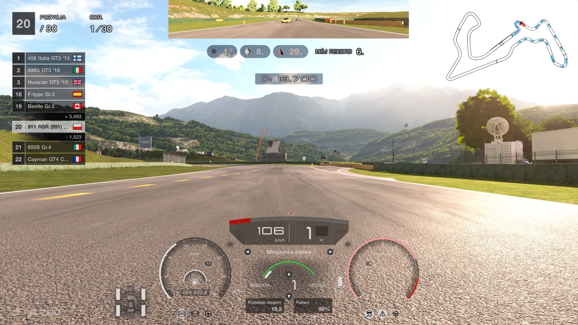 Natomiast w grze Gran Turismo Sport bardzo przypadło mi do gustu sterowanie unikatowym pokrętłem, które znajduje się w dolnej prawej części kierownicy. Za jego pomocą możemy regulować parametry auta takie jak kontrola trakcji, ustawić balans hamulców, zarządzać mieszanką paliwa, włączyć nawigację toru oraz spojrzeć na ostatnie czasy okrążeń. Wszystko to bez wstrzymywania gry, fantastyczna opcja dla graczy, którzy lubią mieć wszystko w trakcie wyścigu pod kontrolą.