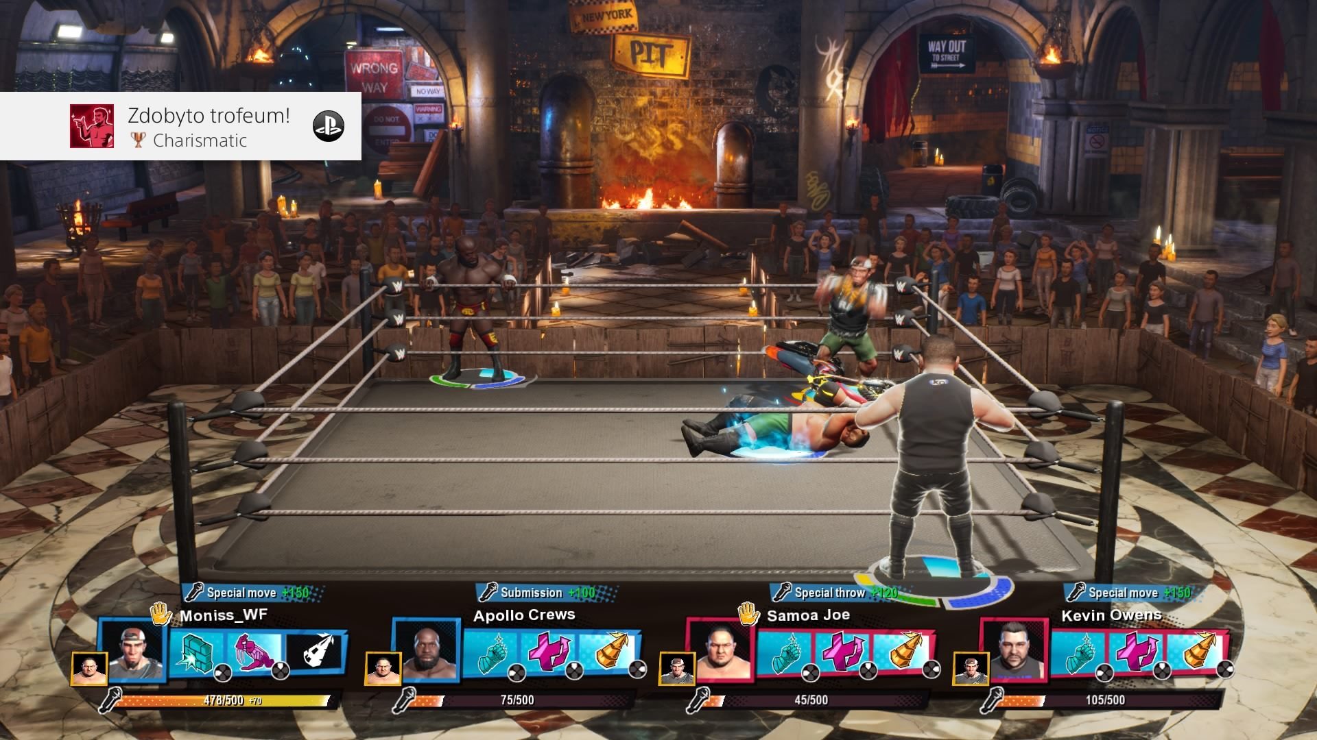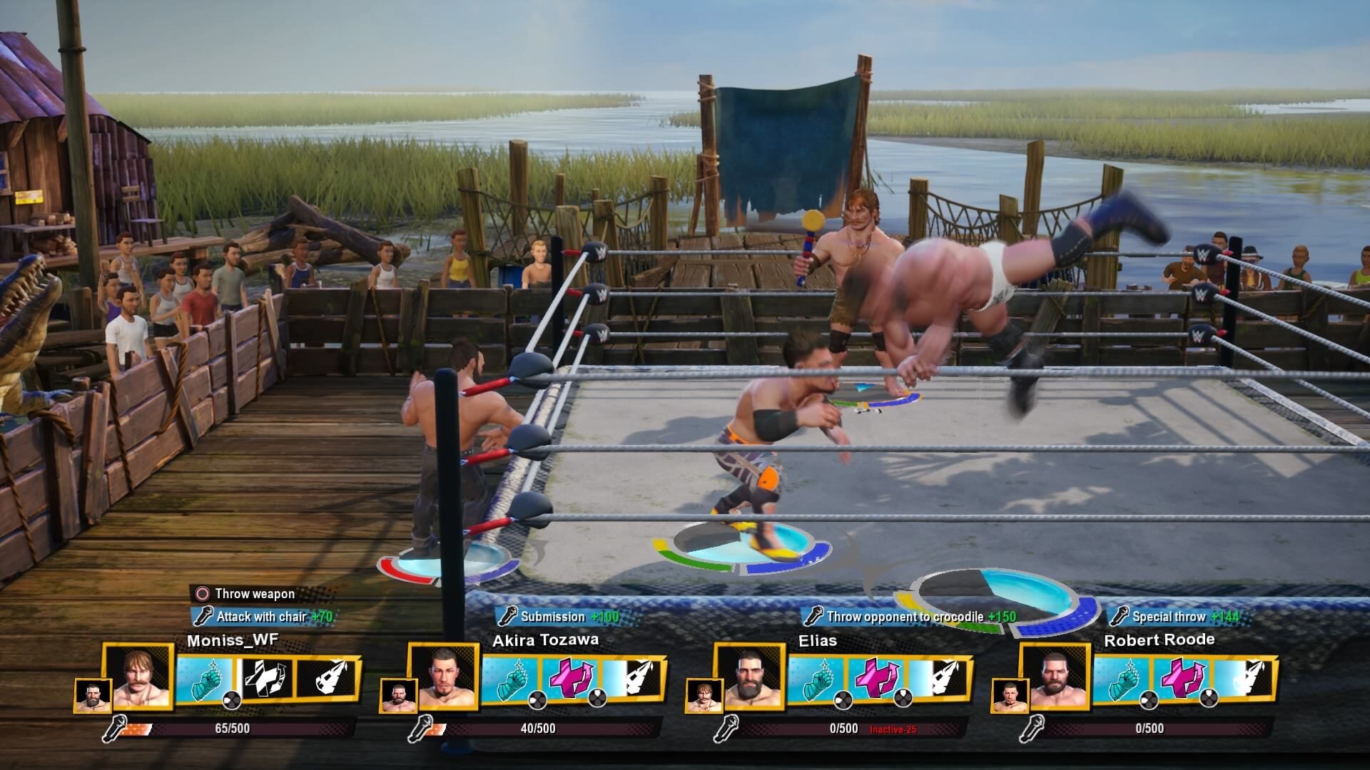 Finishery, które są charakterystyczne dla odpowiednich wrestlerów i tego typu sportu, zostały zmieszane w formę losowych chwytów czy pseudoefektownych uderzeń i podbić. Nie ma mowy o jakiejś większej strategii, ani tym bardziej nie ma znaczenia kogo wybierzemy, bo 6 klas postaci walczy do siebie bardzo zbliżenie. Podczas walki mamy możliwość wspomagać się coraz bardziej szalonymi przedmiotami, jak gitara czy motocykl, lub, jeśli akurat walczymy w ringu pośrodku bagien, skorzystać z pomocy krokodyla i poczęstować go naszym przeciwnikiem. Kolejną nowinką, która ma urozmaicić rozgrywkę jest możliwość skorzystania z power-upów – przypisujemy sobie po trzy na każdą potyczkę. Mogą one wywrócić naszą rozgrywkę do góry nogami, bo umiejętnie dobrane stanowią dobre wspomaganie. Możemy na przykład przez określony czas leczyć obrażenia, przełamywać blok przeciwnika, czy zadawać mocniejsze ciosy. Na początku jednak dostaniemy tylko kilka podstawowych ruchów i, tak samo jak zawodników, resztę musimy odblokować spędzając czas w trybie kariery. Jest to ciekawe ubarwienie i tak mocno już zręcznościowej rozgrywki, ale przynajmniej w moim przypadku nigdy gra nie postawiła aż takiego dużego wyzwania, by miały mnie uratować z opresji. Być może młodszym graczom taka pomoc da znacznie więcej frajdy. Niestety nie oznacza to, że każdy powinien znaleźć coś dla siebie. Przez dużą wtórność gracz grający samemu znajdzie tutaj niewiele zabawy.