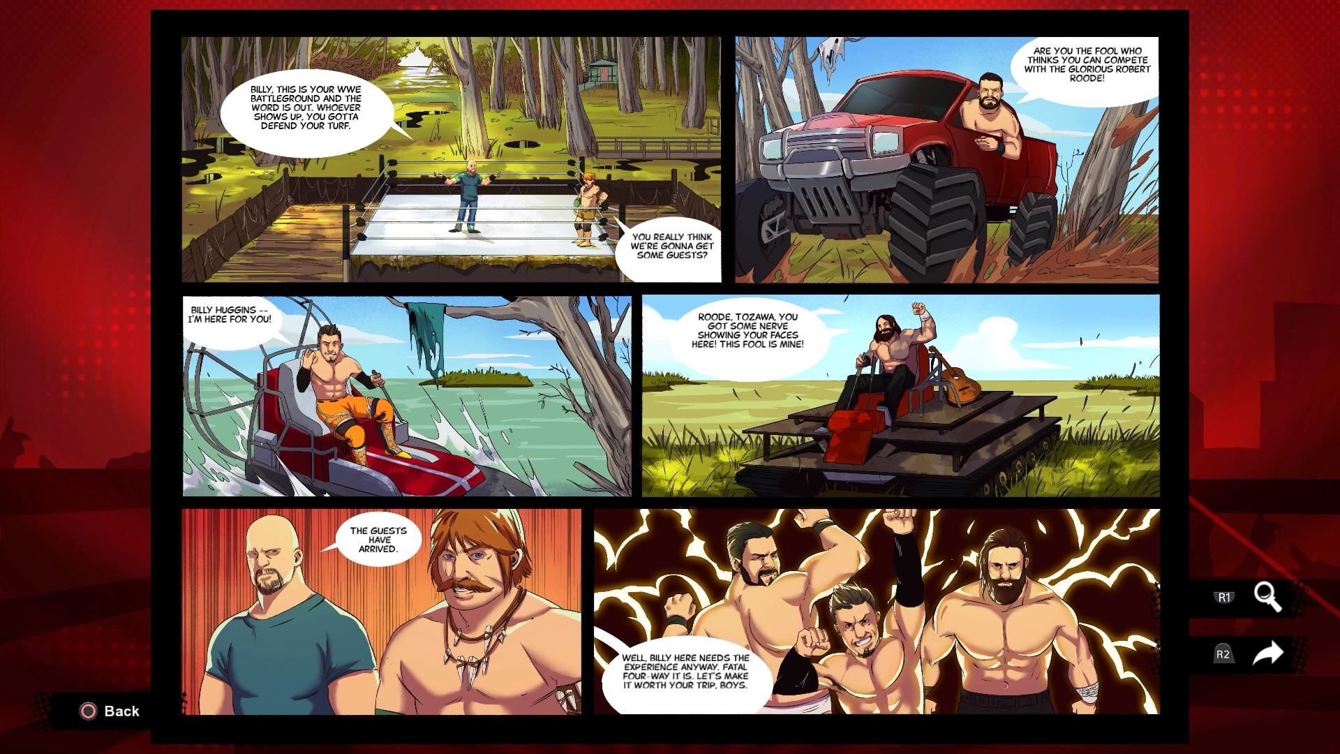 Jeśli chodzi o samych fanów wrestlingu, tym, co najmocniej trzyma przy tego typu sportowej rozrywce są przede wszystkim angażujące historie, charyzmatyczni zawodnicy i dobre walki. Jako gracz, a przede wszystkim wieloletnia fanka wrestlingu, powinnam być głównym odbiorcą, do którego skierowany jest tego typu produkt. Jednak trzeba zaznaczyć, że dla twórców nie był to podstawowy wyznacznik, bo pierwszym, co zauważymy po spędzeniu kilku godzin z Battlegrounds jest fakt, że to tytuł o bardzo niskim progu wejścia. Gra nie jest ukierunkowana tylko na fanów tego rodzaju walk. Prostota to idealne określenie, jakim można scharakteryzować cały zamysł studia – począwszy od bardzo uproszczonego menu, w którym możemy bardzo szybko rozegrać wybrany przez siebie tryb walki, po esencję tego typu gier – starć. Ogromną wartością dla osób mających dopiero przez ten tytuł pierwszą styczność z amerykańskim sportem jest wyjaśnianie zasad w formie krótkich komiksowych regułek. Niedoświadczonych graczy nie zrazi też – zwykle przy tych tytułach rozbudowany – wybór technik. Wrestlerzy jak i ich zdolności zostali sprowadzeni do prostych wyróżników dzielących ich na klasy, jak powerhouse czy high-flyer, przez co mimo bardzo przyjemnie dla oka stworzonych postaci i poprawnych odwzorowań pierwowzorów z WWE, dostajemy zawodników, których techniki zlewają się w jedną papkę. Warto podkreślić osobom, które na co dzień nie śledzą zmagań w federacji, że jest to ogromne zaniedbanie. Przykryto warstwą wizualną to, co najbardziej przyciąga.