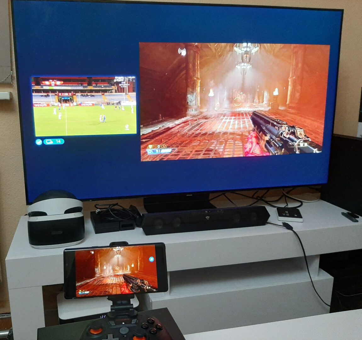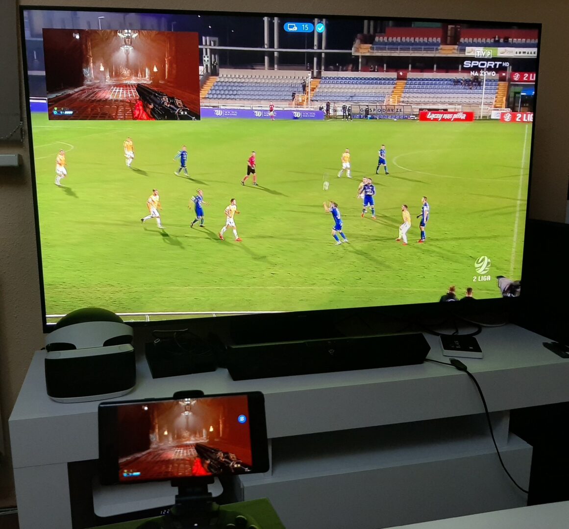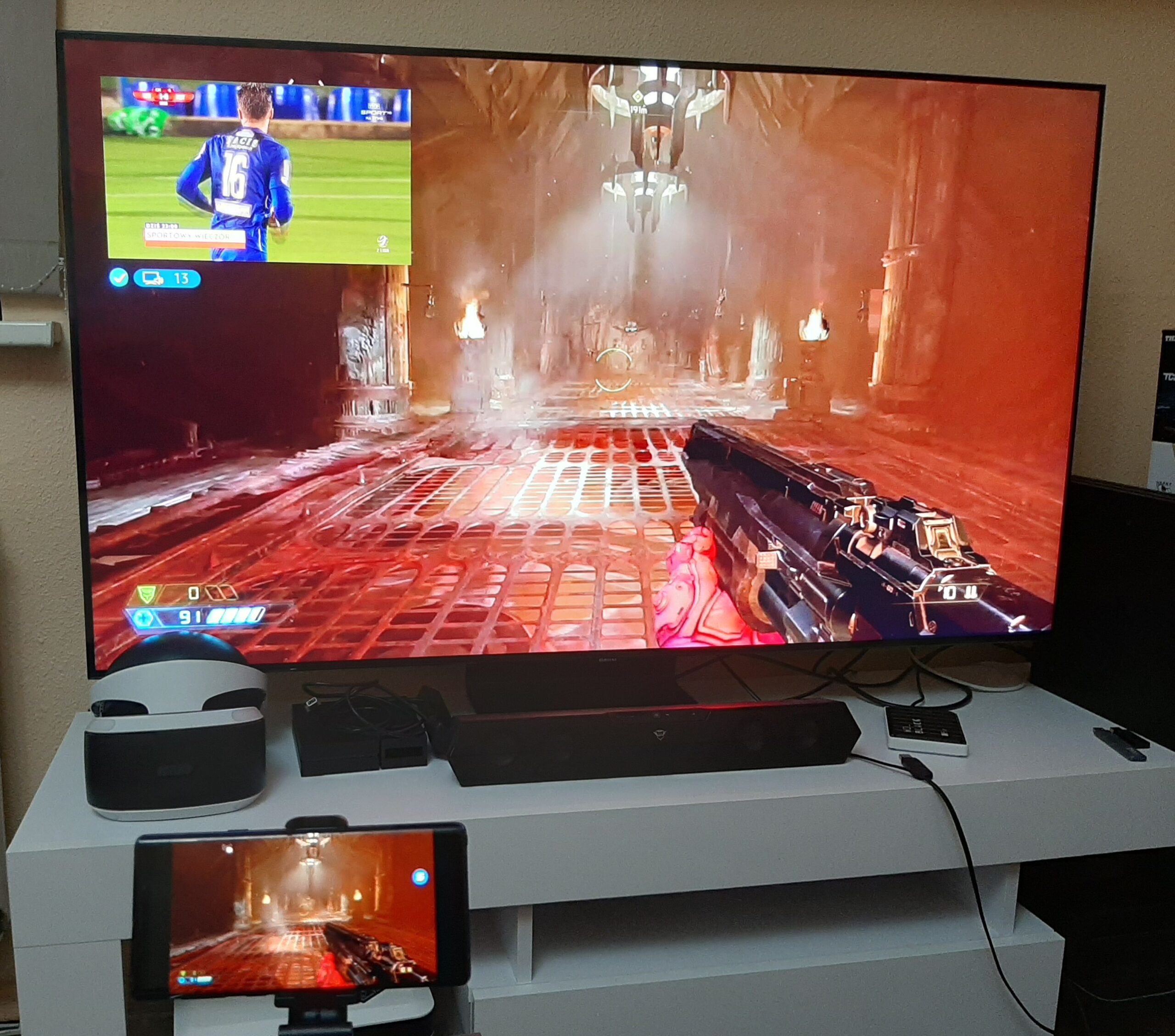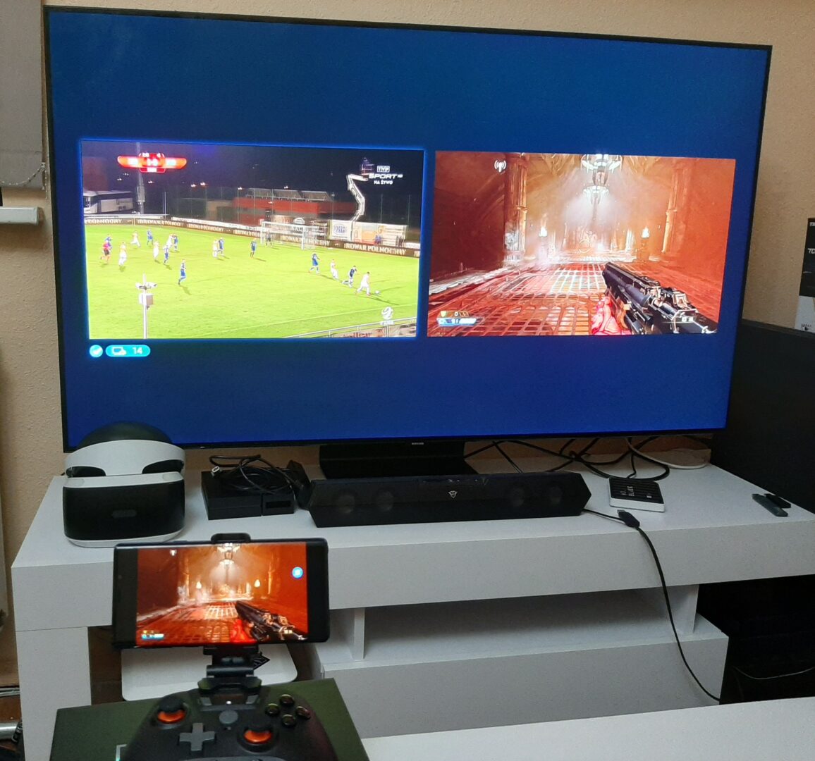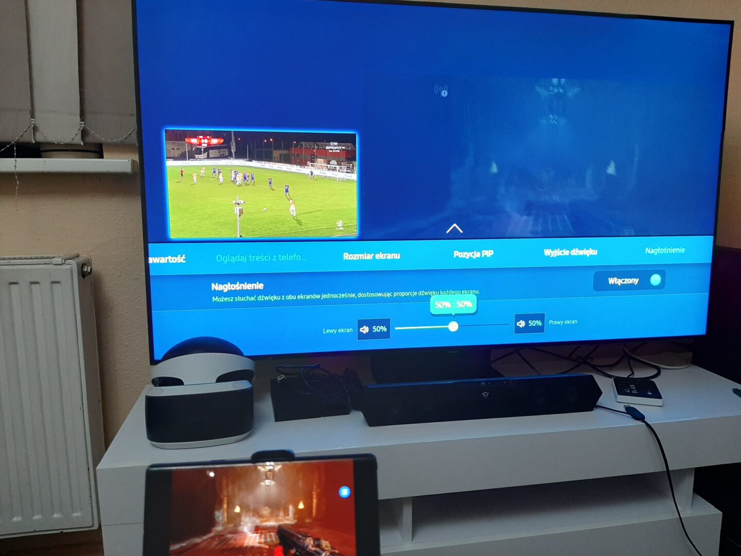 Co ciekawe, dzięki funkcji Multi View na ekranie telewizora mogą być wyświetlane ekrany z dwóch źródeł. Jednym może być wspomniane odbicie lustrzane smartfona lub po prostu odpalona dowolna konsola z grą, a na drugim ekranie może być odpalony dekoder telewizji cyfrowej z meczem lub np. aplikacja YouTube. Dzięki wielu ustawieniom możemy oba ekrany dowolnie rozmieszczać na telewizorze, a jak by tego było mało, telewizor jest w stanie odtwarzać dźwięk z obu urządzeń, przy czym my regulujemy, z którego nadajnika dźwięk ma być głośniejszy.