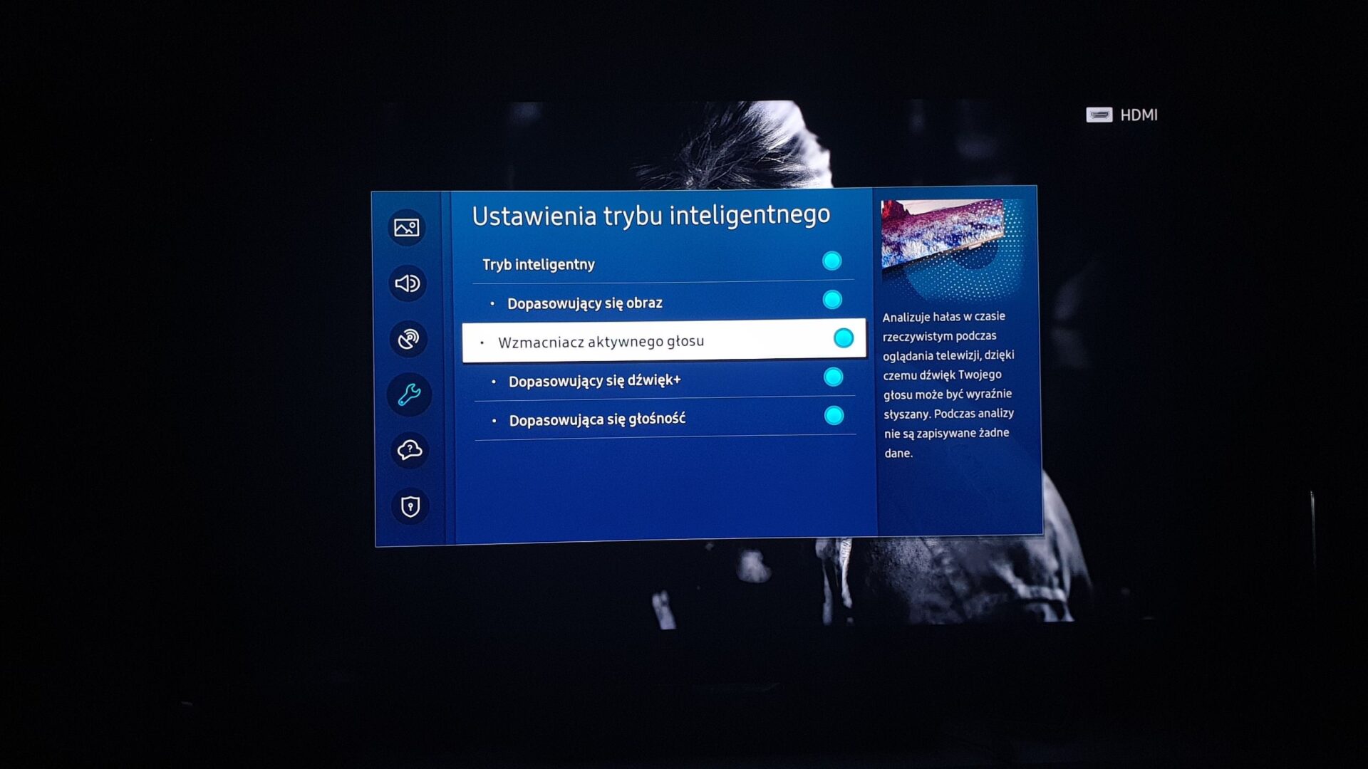 Czasami zdarza się, że w pobliżu pojawiają się szumy lub inne niepożądane dźwięki (np. wiertarka zza ścianą, suszarka itp.). Nie musimy już zwiększać głośności, by usłyszeć dialogi. Aktywny Wzmacniacz Głosu zrobi to za nas. Warto podkreślić, że rozwiązanie to nie podnosi głośności dla całej ścieżki dźwiękowej, skupiając się jedynie na słowach wypowiadanych przez filmowych bohaterów.