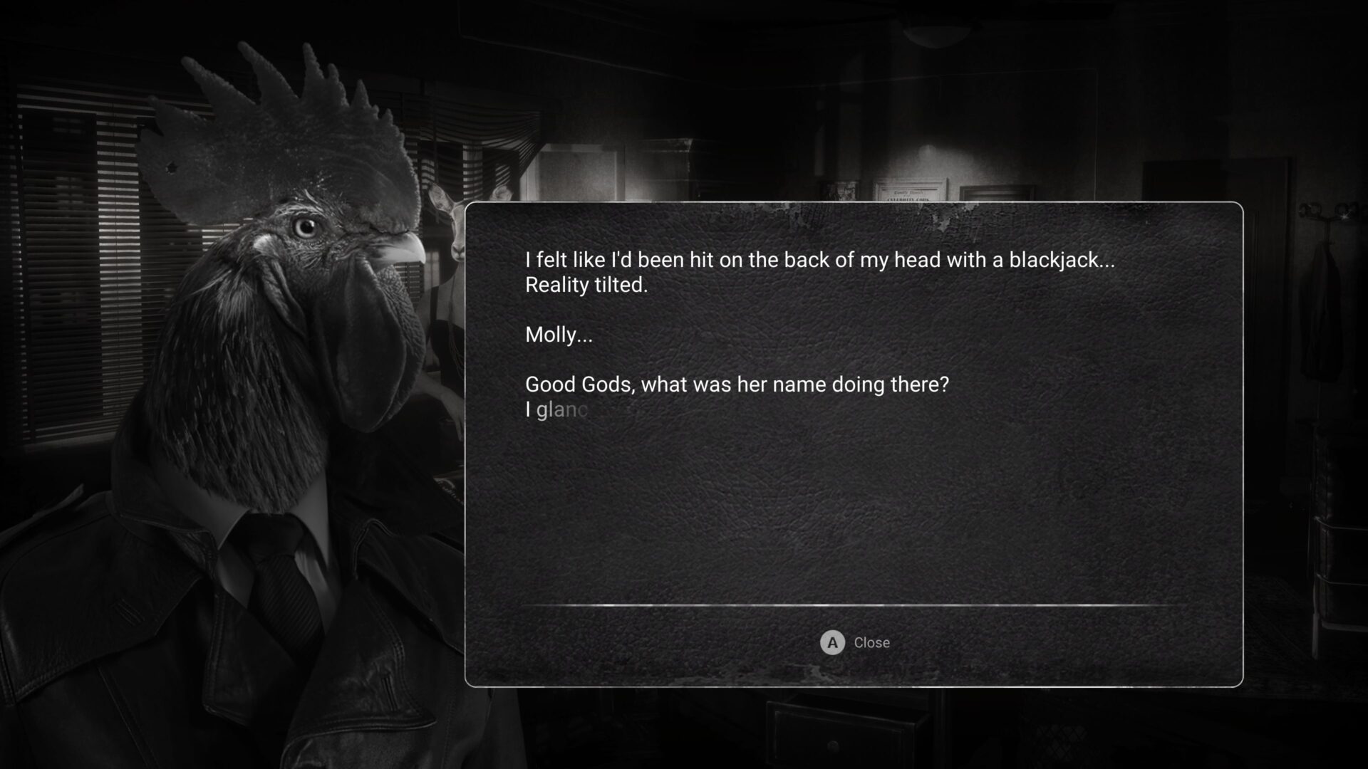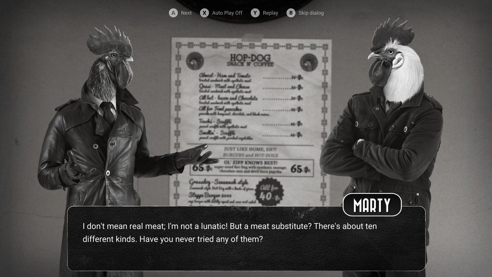 Chicken Police to jednak nie tylko Sonny, to jeszcze Marty, partner głównego bohatera z czasów, gdy jeszcze pracował w policji. Pierwsze rozmowy z drugim Kogutem ładnie pokażą nam, że ich relacja nie jest idealna, ale jest silna, bo łączy ich spora przeszłość. Fakt, że postacie mają tyle głębi, pozwala bardzo mocno wsiąknąć w fabułę gry.