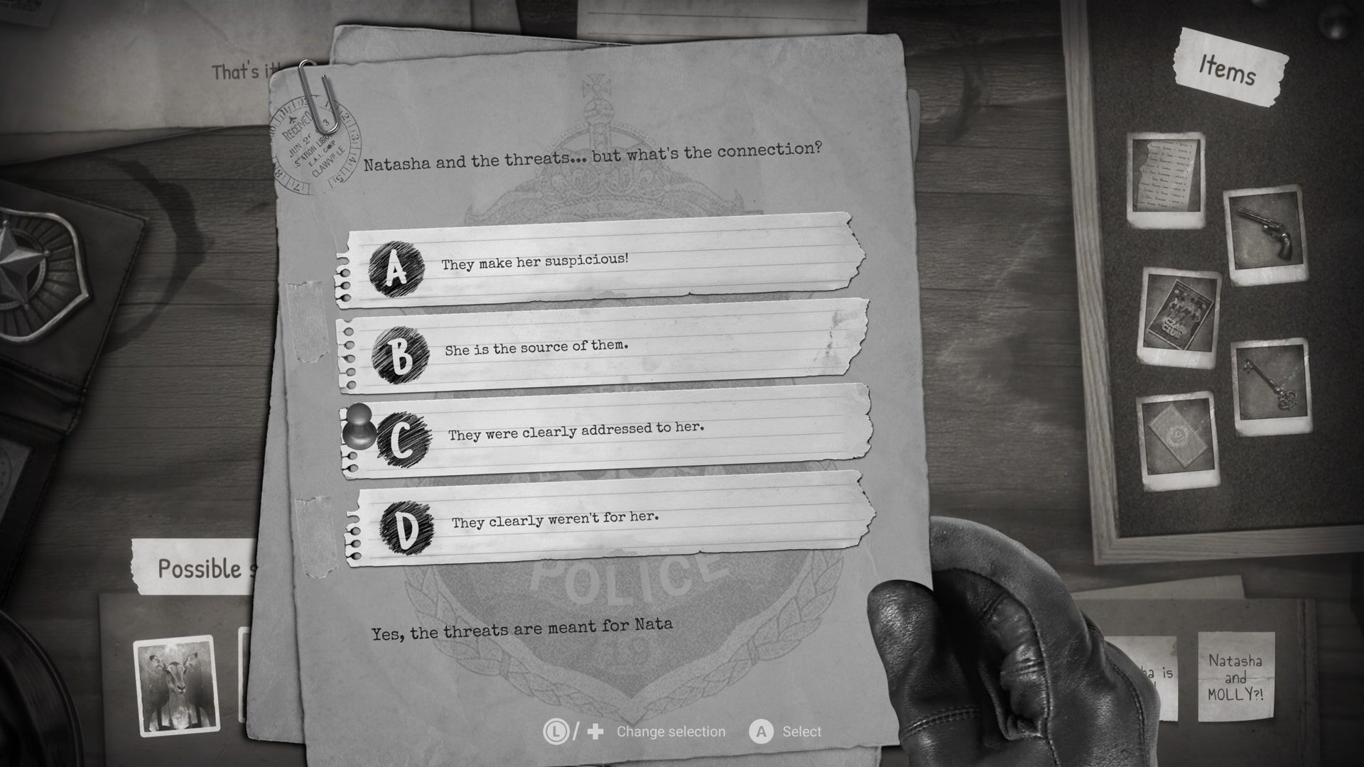 Pomimo czerni i bieli (z okazjonalnymi mocnymi akcentami), nie mamy wrażenia, że wszystko jest nijakie. Przedmioty mają na tyle wyraźne kształty, że wczuwamy się w klimat noir i zapominamy nawet o chceniu kolorów. Tak ma być i koniec. I to działa.