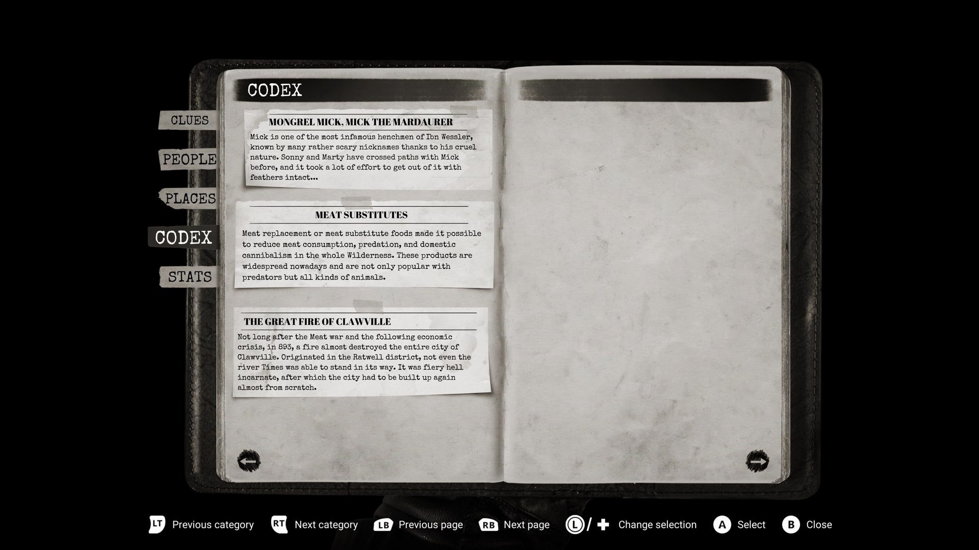 Chicken Police to solidny tytuł. Jeśli lubicie wciągające historie, które gra się prawie jak film lub po prostu chcecie ograć ciekawą grę z łamigłówkami, to to właśnie to. Świat gry jest tak bogaty, że godzinami można rozmawiać z postaciami i czytać przygotowane notatki. W dzienniku Sonny’ego znajdziemy wszystkie najważniejsze rzeczy, jak odkryte miejsca, informacje o poznanych ludziach czy kodeks. W kodeksie znajdą się najbardziej szalone notatki. To z nich dowiemy się o tym, jak wygląda obecnie świat, z czego robione są burgery i co aktualna populacja Ziemi wie o ludziach.