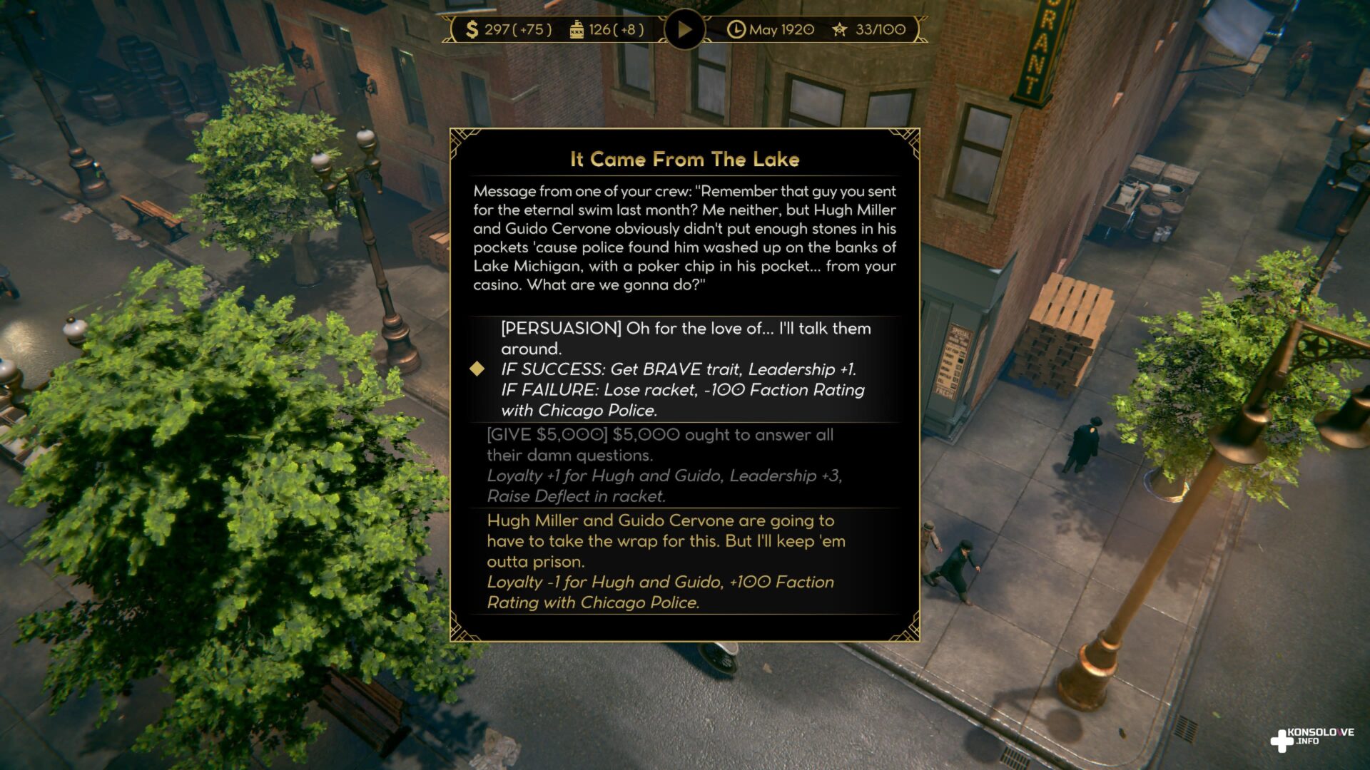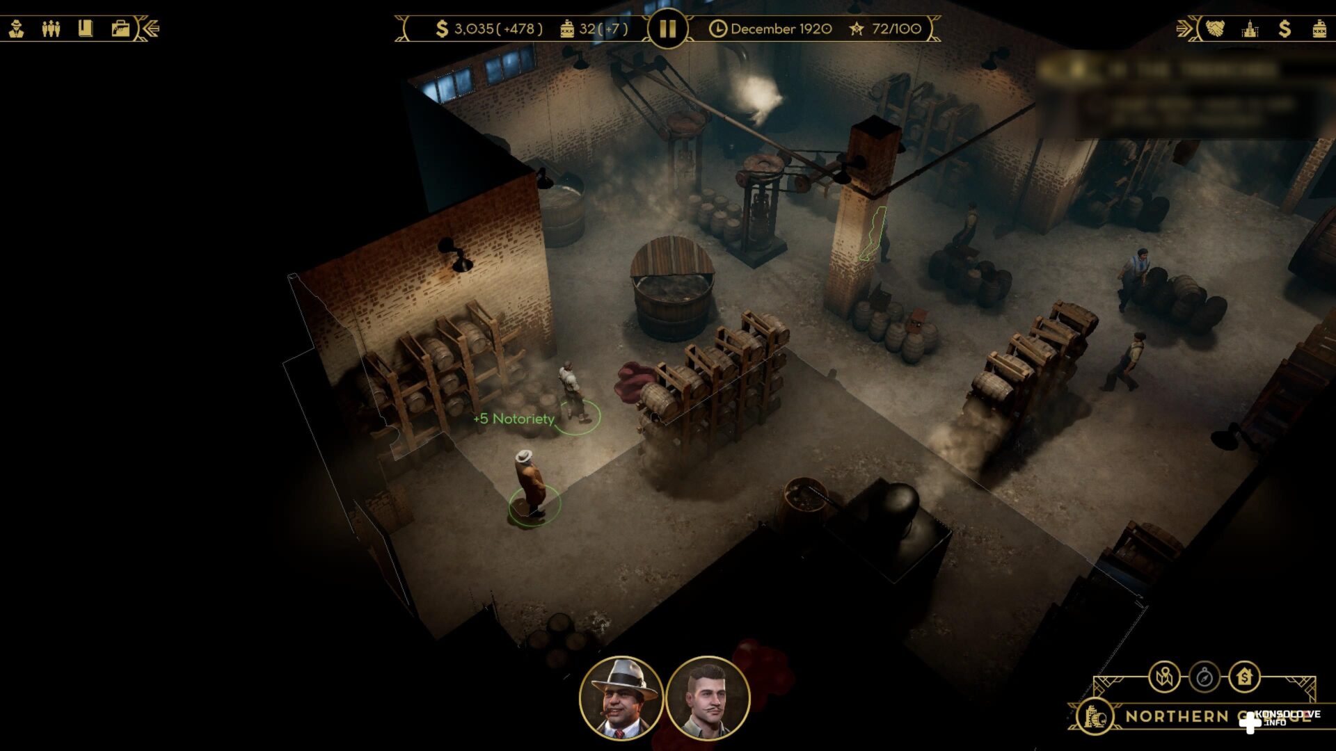 Musimy również zarządzać naszym gangiem. Możemy zwerbować niemal 60 osób, które w istotny sposób wpłyną na możliwości, jakie będziemy mieć podczas naszej rozgrywki. Niektórzy gangsterzy będą korzystali z materiałów wybuchowych, inni będą lepsi z bronią krótką, jeszcze kolejni to profesjonaliści jeśli chodzi o karabiny maszynowe. Co najważniejsze, należy zwracać uwagę na relacje naszych gangsterów między sobą. Nierzadko natkniecie się na mężczyznę lubiącego innego gangstera i kochającego kobietę z naszej rodziny, ale nienawidzącego innej osoby z mafii – do tego stopnia, że nie będzie w stanie przebywać z nią jako jedna rodzina. Często zobaczycie, podchodząc do kandydata komunikat, że chętnie by do nas dołączył, ale nie zrobi tego, bo jest u nas Pan Iksiński. Oczywiście nie możecie się nastawić na to, że do naszej mafii dołączy każdy, kogo tylko spotkamy – każdy gangster generuje miesięczne koszty utrzymania, które musimy pokryć. Empire of Sin na każdym kroku dowodzi, że odpowiednie zarządzenie finansami to podstawa każdej organizacji.