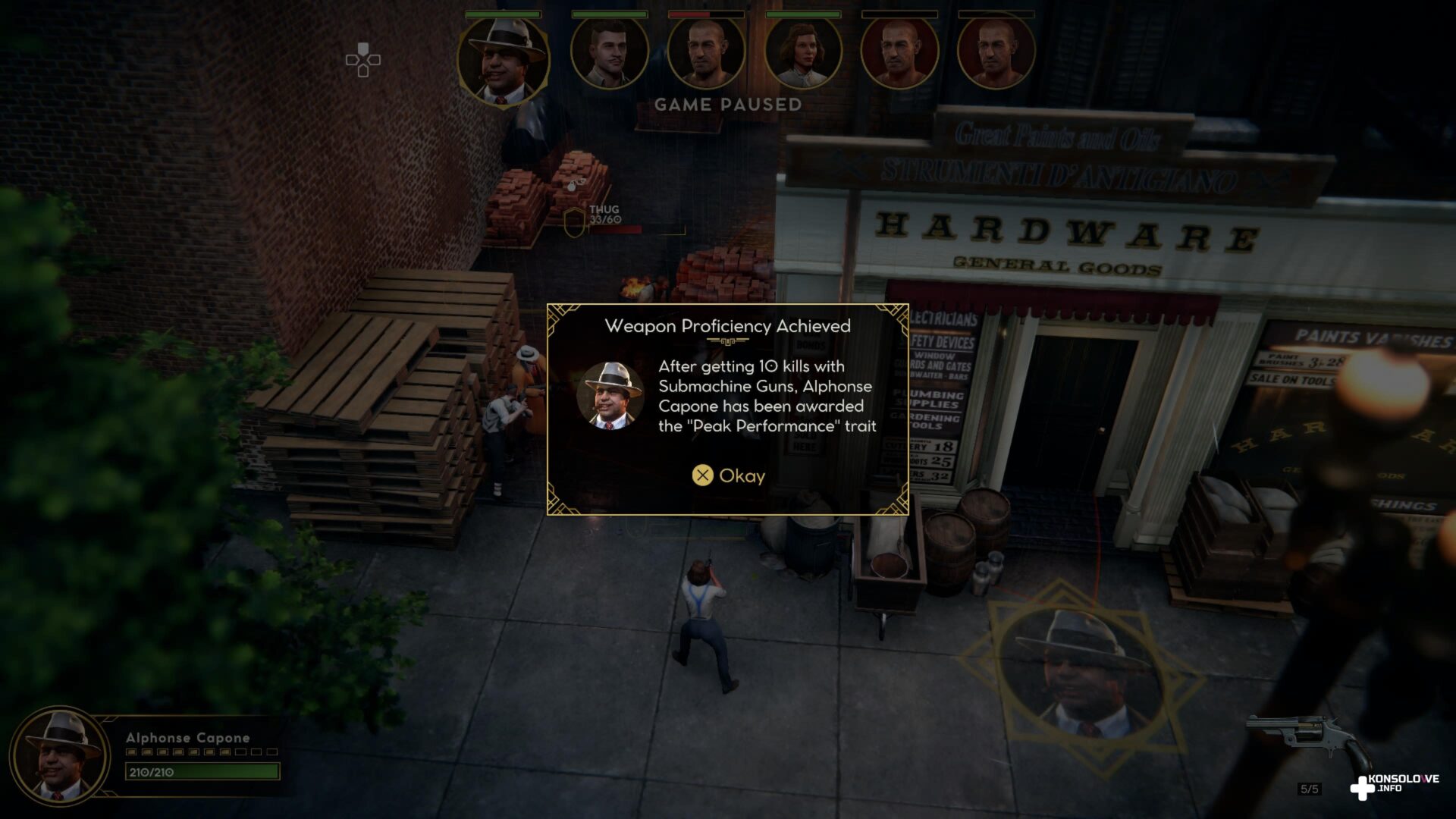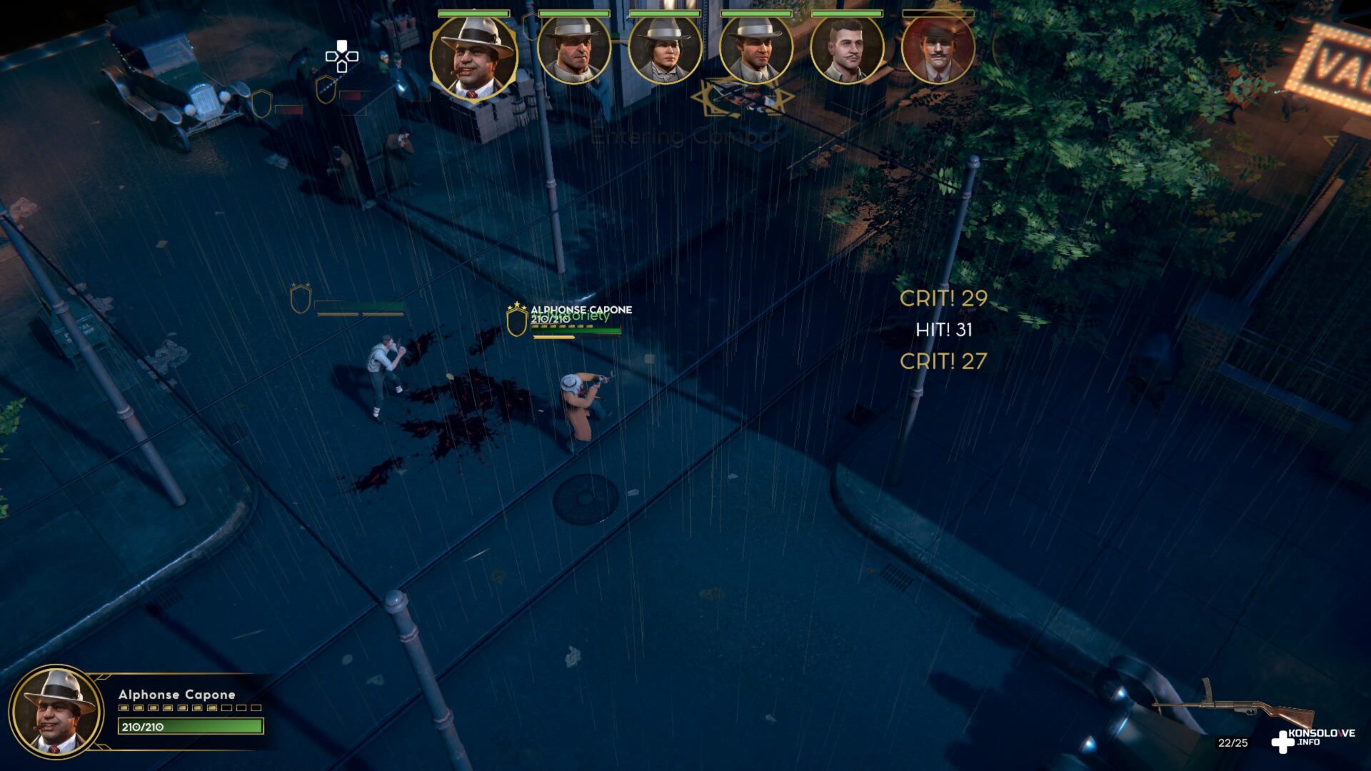 Starcia w Empire of Sin są zrealizowane turowo. Przemierzając Chicago – samotnie bądź z członkami naszej mafii (więcej na ten temat później) – możemy natknąć się na członków rywalizujących z nami rodzin. Naciskając O na padzie (w przypadku recenzowanej wersji na PS4 – kompatybilnej oczywiście z PS5, na której to konsoli grałem w produkcję Romero Games), wejdziemy do trybu walki. Zobaczymy wtedy podzielone na kwadraty pole, po którym mogą poruszać się nasi mafiozi. Wychylając lewą gałkę analogową, wybieramy miejsce, w które chcemy się udać. Musi ono oczywiście mieścić się w dostępnym dla danej osoby obszarze. Następnie potwierdzamy ruch przyciskiem X. Jeśli nasz ruch nie był specjalnym zagraniem kończącym turę i mamy jeszcze punkt akcji, to możemy jeszcze wykonać kolejny manewr. Może to być przybranie pozycji Overwatch – oczekiwania na ruch przeciwnika i automatyczne oddanie strzału, nawet poza naszą turą, ukucnięcie za osłoną terenową (co w naturalny sposób zmniejsza szansę na trafienie nas przez ostrzał oponenta), oddanie strzału z jednej z naszych broni, czy wykorzystanie wyuczonej specjalnej akcji. Może to być na przykład ostrzał osłaniający, rażący wszystkich przeciwników na zadanym obszarze. Nie bez znaczenia jest konieczność przeładowywania broni – o ile w niektórych grach taki obowiązek mnie drażni, o tyle w Empire of Sin pasuje to do czasów, w jakich toczy się akcja. Nie ukrywam, że dzięki konieczności dbania o poziom amunicji miałem wrażenie obcowania z dość starą grą i byłem bardzo pozytywnie zaskoczony tym elementem. Każdy nasz atak ma oczywiście procentową szansę na powodzenie – jestem miłośnikiem takiego rozwiązania. Wymaga ono często kombinowania, jak podejść, starając się zadać jak największe obrażenia i wykonać pewny cios.