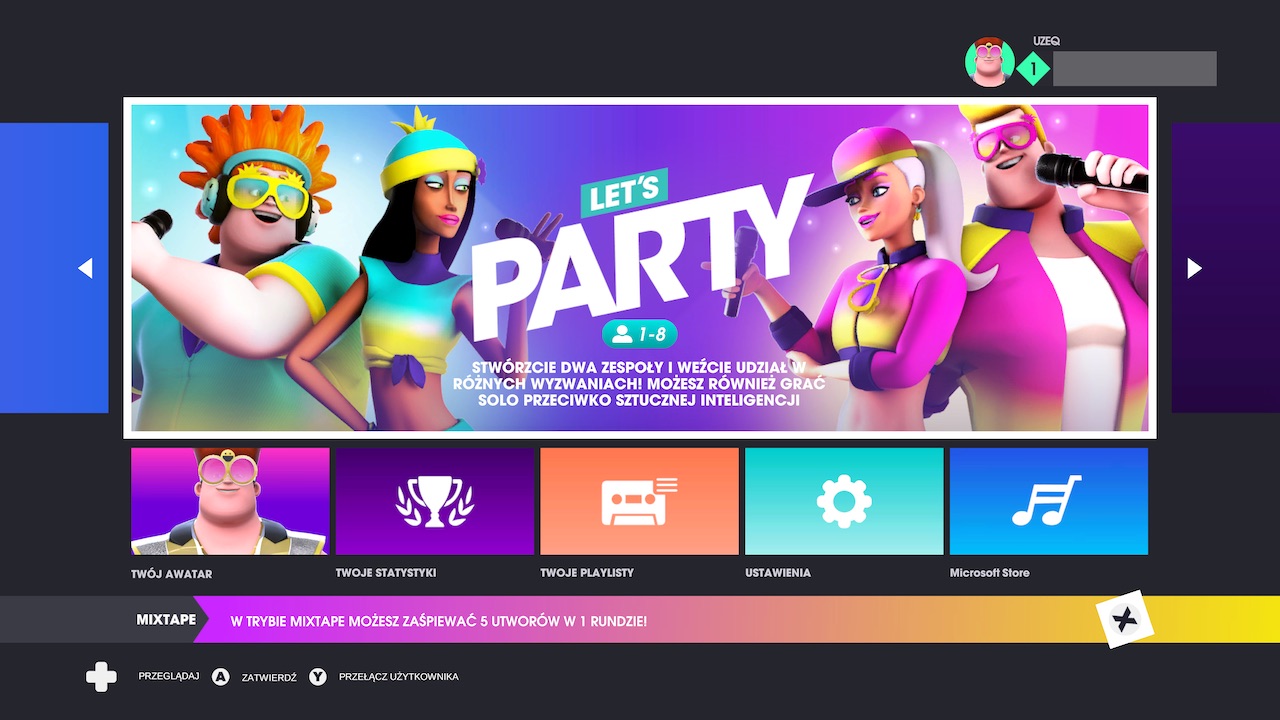 Nie mogło zabraknąć trybów wieloosobowych, duetów, współpracy i rywalizacji, ale dla mnie najciekawszym był tryb Mix Tape. Gra serwuje nam wtedy 4 fragmenty z 4 piosenek. Nie śpiewamy więc ich w całości, a jedynie wybrane fragmenty. Do wyboru jest kilka filtrów, więc np, możemy pośpiewać same miłosne piosenki, albo same starsze utwory. Ten tryb zdecydowanie przypadł mi do gustu i nie spotkałem się chyba z niczym podobnym w innych tego typu grach.