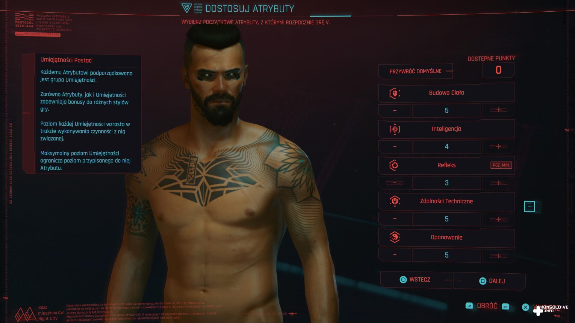 Naszą rozgrywkę rozpoczynamy od stworzenia wyglądu swojej wersji V. Mamy do wyboru oczywiście sylwetkę – męską bądź żeńską, ale też wiele opcji i suwaków wpływających na to, jak najemnik (bądź najemniczka), w których się wcielamy będą się prezentowali. Jeśli niektóre z opisów w tym tekście będą się Wam wydawały za mało szczegółowe i chcielibyście dowiedzieć się więcej na jakiś temat, dajcie znać w komentarzach. Postaram się uwzględnić Wasze sugestie przy pisaniu pełnej recenzji lub odpowiedzieć na część z nich pod niniejszym tekstem. Nie wchodząc w detale, możemy zadecydować między innymi o rodzaju i długości genitaliów V, sutkach, oczach, czy tatuażach. Edytor postaci pozwala na stworzenie takiej wersji V, jaka będzie zgodna z naszymi preferencjami i wczucie się w tego bohatera nie sprawia najmniejszych trudności. Warto zaznaczyć, że możemy także wybrać męski wygląd i żeński głos oraz na odwrót. Trzeba też wspomnieć, ze nasza decyzja przy opuszczaniu edytora postaci powinna być świadoma. W grze nie ma bowiem możliwości zmiany wyglądu ciała naszej postaci i musimy działać z tym, co zaakceptowaliśmy na początku.