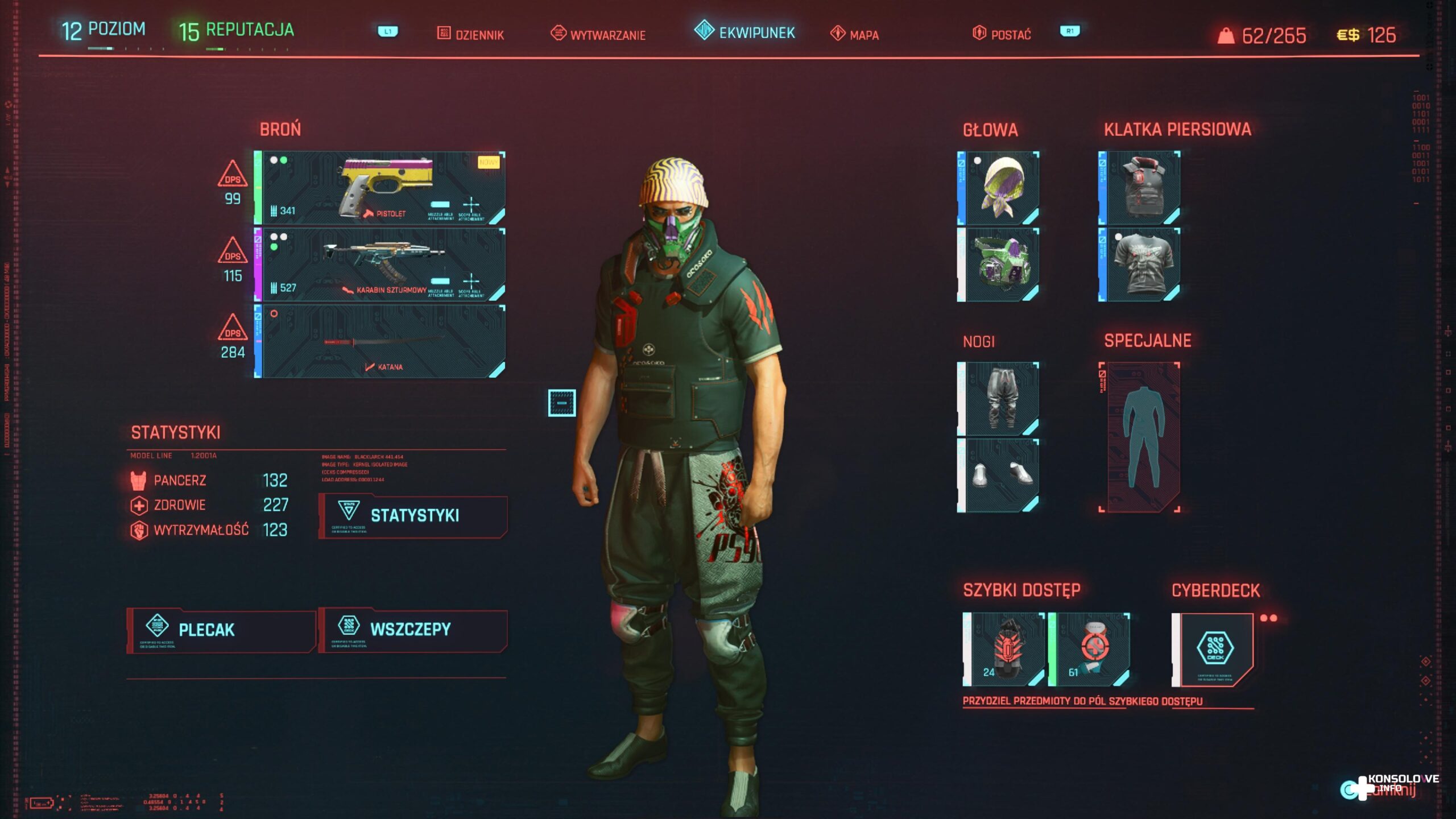 Nie oznacza to oczywiście, że CD Projekt RED nie pozwala nam przebierać bohatera (będę się odnosił do męskiego wariantu V – na taki zdecydowałem się podczas mojej rozgrywki). Podczas przemierzania Night City natkniemy się na niezliczoną ilość elementów stroju. Kapelusze, kołnierze, okulary, maski, płaszcze, marynarki, spodnie, kurtki, koszulki, buty – niewątpliwie jest w czym przebierać. Podczas zakładania ciuchów dobrze jest uwzględniać nie tylko wygląd ubioru. Każdy element wyposażenia jest opisany przez statystyki. Zaręczam Wam, że będziecie przeglądać swój ekwipunek, starając się nie tylko znaleźć coś, w czym będziecie dobrze wyglądać, ale też – a może przede wszystkim – mieć największe szanse na przeżycie w Night City. Dostosowanie nie kończy się bynajmniej na ubiorze. Cyberpunk 2077 jest przepełniony mnóstwem rodzajów uzbrojenia. Są katany, pistolety, karabiny maszynowe, strzelby, karabiny szturmowe, snajperski. Jednak na tym podziale nie kończy się zróżnicowanie arsenału V. Broń wyróżnia się typem stosowanej amunicji. Możemy na przykład mieć spluwę typu power, która zadaje ogromne obrażenia i przebija się przez osłony terenowe, ale niewykluczone, że będziecie preferowali amunicję smart – lecącą w stronę przeciwnika (po namierzeniu go) również kiedy się poruszamy i teoretycznie tracimy oponenta z zasięgu wzroku. Aby jednak móc korzystać z takiego typu pocisków, niezbędne jest zamontowanie sobie odpowiedniego wszczepu smart.