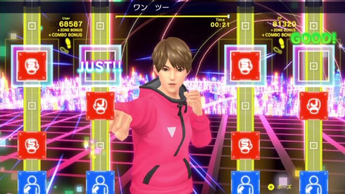 Tak, liczcie w myślach i bujajcie bioderkami, w końcu podtytuł „Rythm & Excercise” to nie tylko puste słowa. Jak to bywa w grach opartych o rytm, najważniejsze to wykonać odpowiednie ruchy we wskazanym czasie. Na początku wybrany instruktor nauczy nas prostych ciosów. Przyznam szczerze, że albo wsadzałam w nie za mało siły, albo Joy-Cony rejestrowały moje machnięcia z lekkim opóźnieniem, bo nie zawsze wpadał mi perfect. Z kolejnymi treningami nauczymy się haków i ciosów sierpowych, więc także i one dołączą do choreografii. Miałam z nimi nie lada problem i po przejrzeniu różnych for dyskusyjnych – nie byłam odosobniona. Konsola nie ma kamery, która mogłaby rejestrować moje ruchy. Ciosy rejestrowane są za pomocą czujników w Joy-Conach, ale też w grę wchodzi nakład siły, który wkładamy w wykonanie zamachu. Żeby trafić w odpowiednim tempie, który widzimy na ekranie musimy najpierw wyczuć, jak gra rejestruje dany cios. W moim odczuciu nie było to ani intuicyjne, ani też nie mobilizowało mnie, żeby wykonać je jak najbardziej poprawnie.