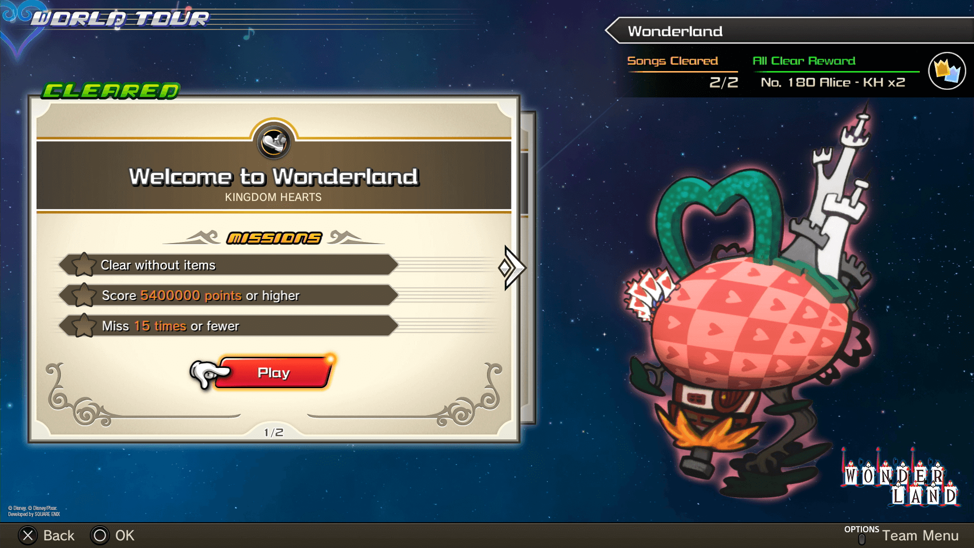 World Tour prowadzi nas przez historię Sory i spółki, od pierwszej części Kingdom Hearts, aż po koniec Kingdom Hearts III. Podróżujemy Gumi shipem po światach, w których znajdują się jedna, lub dwie piosenki. Światy tworzą zamkniętą klamrę wokół poziomów rytmicznych i odwzorowują układ znany z poszczególnych części serii. Każdy poziom zawiera 3 misje, za których wykonanie zdobywamy gwiazdki. Tylko jeśli będziemy posiadać odpowiednią liczbę gwiazdek z wykonanych misji, będziemy mogli posuwać się dalej w fabule. W ten sposób gra wymusza na nas, aby dobrze ją opanować i nie iść na łatwiznę, zaliczając piosenki tylko na najniższym poziomie trudności. Próbując przejść po linii najmniejszego oporu szybko napotkamy ścianę, która wymusi na nas powrót do rozegranych piosenek i zmierzenie się z nimi na wyższym poziomie trudności. Podoba mi się to działanie, bo zmusza gracza do zapoznania się z mechaniką rozgrywki i polepszania swoich umiejętności.