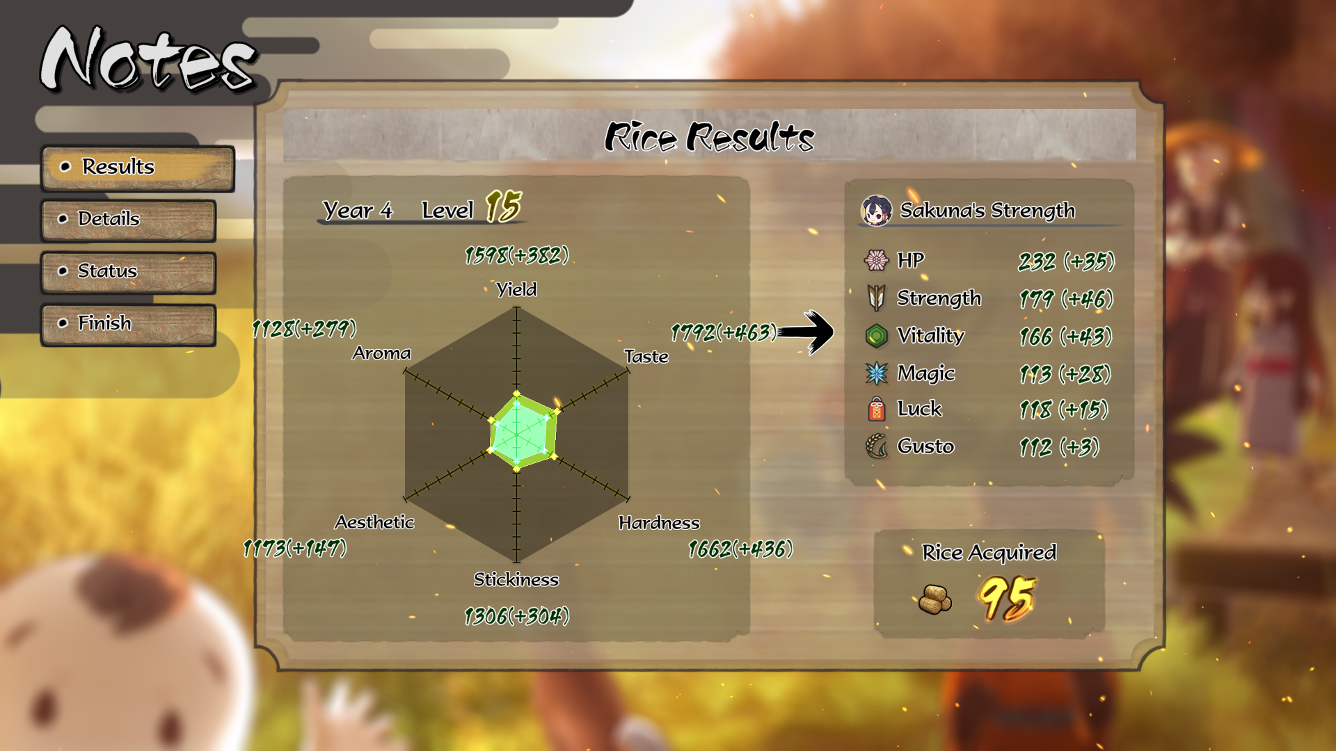 Od jakości ryżu bezpośrednio zależą statystyki Sakuny. Aby wyrósł idealnie, musimy dbać o odpowiedni poziom wody, dodawać jak najlepsze komponenty do nawozu, pamiętać o wyrywaniu chwastów i osłaniać nasze pole przed pasożytami. Pracy jest sporo, a niestety gra daje niewiele wskazówek na samym początku. Warto też wspomnieć, że tytuł nigdzie nas nie popędza. Nie ma nagród za osiągnięcie jakiegoś poziomu w wyznaczonym terminie, nie ma dodatkowych bonusów za szybki awans. Niektóre filmiki fabularne odblokowują się tylko po upłynięciu określonej liczby lat, co sugeruje nam nawet, że może lepiej jest skupić się na wykonywanej pracy zamiast gonić do przodu. Niektóre działania związane z ryżem można też powierzyć ludziom – skazujemy się jednak wtedy na gorszą jakość wykonanej pracy.