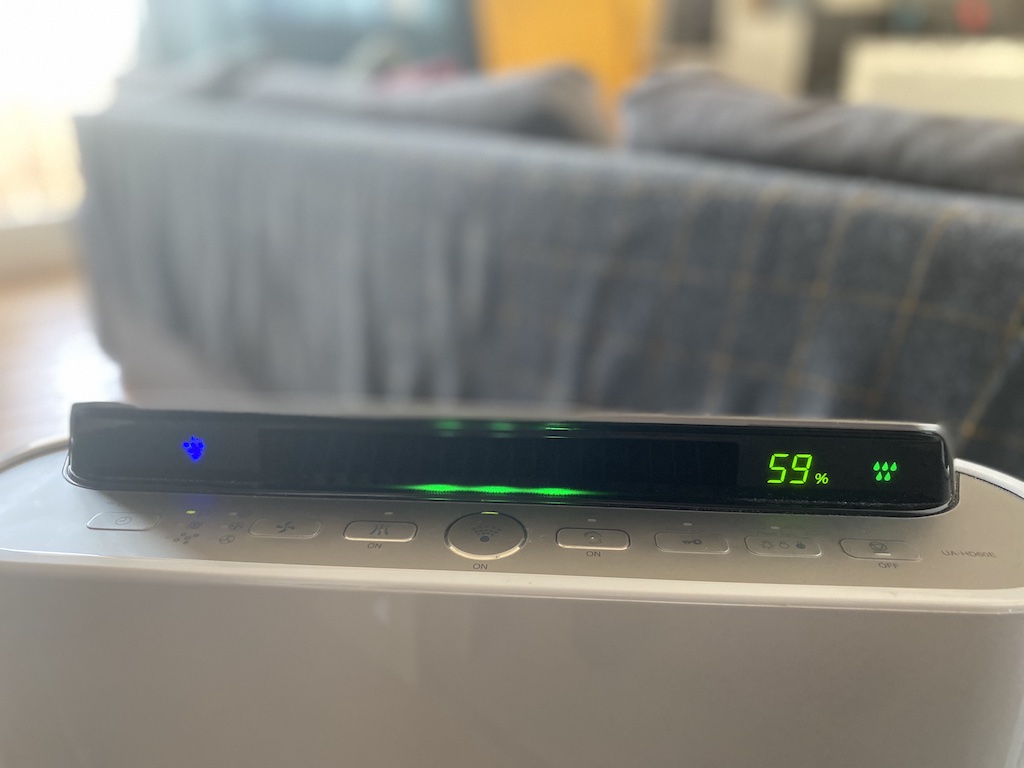 Nad panelem kontrolnym znajdziemy wyświetlacz, który informuje nas o stanie pracy urządzenia. Znajdziemy na nim dedykowaną ikonkę informującą o włączeniu trybu jonizacji. Na przeciwległym końcu ekranu zobaczymy wskaźnik wilgotności powietrza oraz ikonę nawilżacza. Informuje ona nas nie tylko o tym czy nawilżacz pracuje, ale także czy nie skończyła się przypadkiem woda w zbiorniku. Na samym środku wyświetlacza zobaczymy duży różnokolorowy pasek, który swoją barwą określi działania monitora kurzu i zapachu. Oczywiście jeśli linia świeci się na zielono to wszystko jest w jak najlepszym stanie.