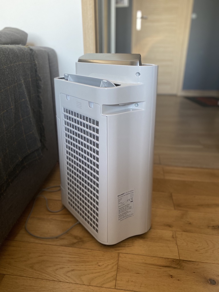 Kilka słów chciałbym dodać też o jonizatorze wbudowanym w urządzenie. Oczyszczacze Sharp posiadają certyfikowaną, autorską technologię Plasmacluster, która neutralizuje cząsteczki wirusów, alergeny, roztocza i smog. Po włączeniu jej urządzenie pracuje przez około godzinę na najwyższych obrotach generując dodatnie i ujemne jony. Warto jednocześnie zaznaczyć, że jest to technologia bezpieczna dla wszystkich domowników. Pamiętać jednak należy, że w czasie pracy tego trybu urządzenie jest odrobinę głośniejsze niż zazwyczaj, warto więc odpowiednio zaplanować jego użycie, tak by nie włączyć go kiedy za chwilę mamy ważny telefon czy spotkanie online.