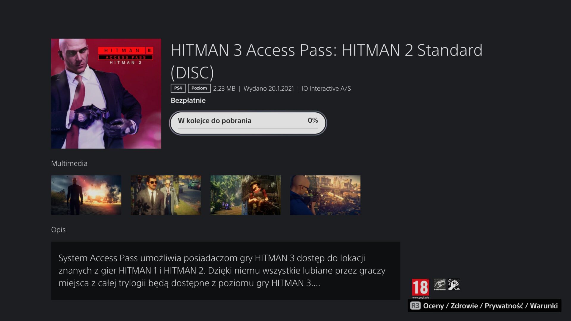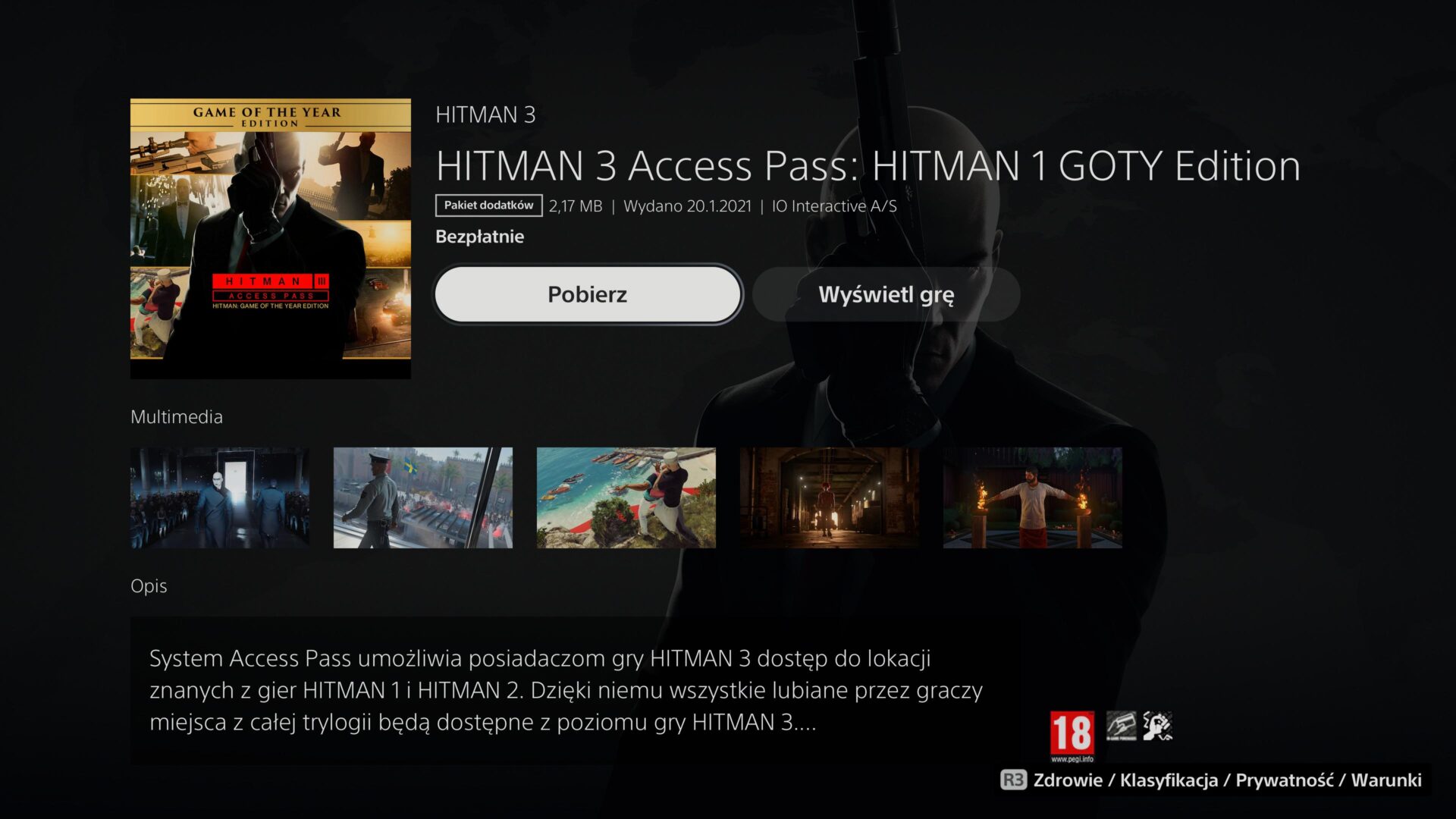 Myślę, że dla wielu z Was najważniejsza jest możliwość zagrania we wszystkie poziomy z World of Assassination w najnowszej odsłonie (oczywiście o ile posiadamy w swojej bibliotece gry, z których te misje pochodzą). Istotnym argumentem przemawiającym, moim zdaniem, za zaimportowaniem poprzednich poziomów do “trójki” jest możliwość zagrania w nie w wirtualnej rzeczywistości na PS VR. No dobrze, ale przejdźmy do samego procesu. Zacznijmy od przejścia do listy dodatków w menu sklepu na naszej konsoli. Jedną z dostępnych nowych zawartości będzie widoczna poniżej – zapewni ona nam dostęp do zadań z pierwszej części trylogii w ostatniej, która miała premierę dwa dni temu. Wybieramy oczywiście Pobierz, po czym włączamy HITMAN 3 od nowa. Misje z jedynki są dostępne w ramach Pakietu Spuścizny, do których zapewniamy sobie dostęp, włączając tę część i wybierając odpowiednią opcję w menu gry w zakładce Sklep.