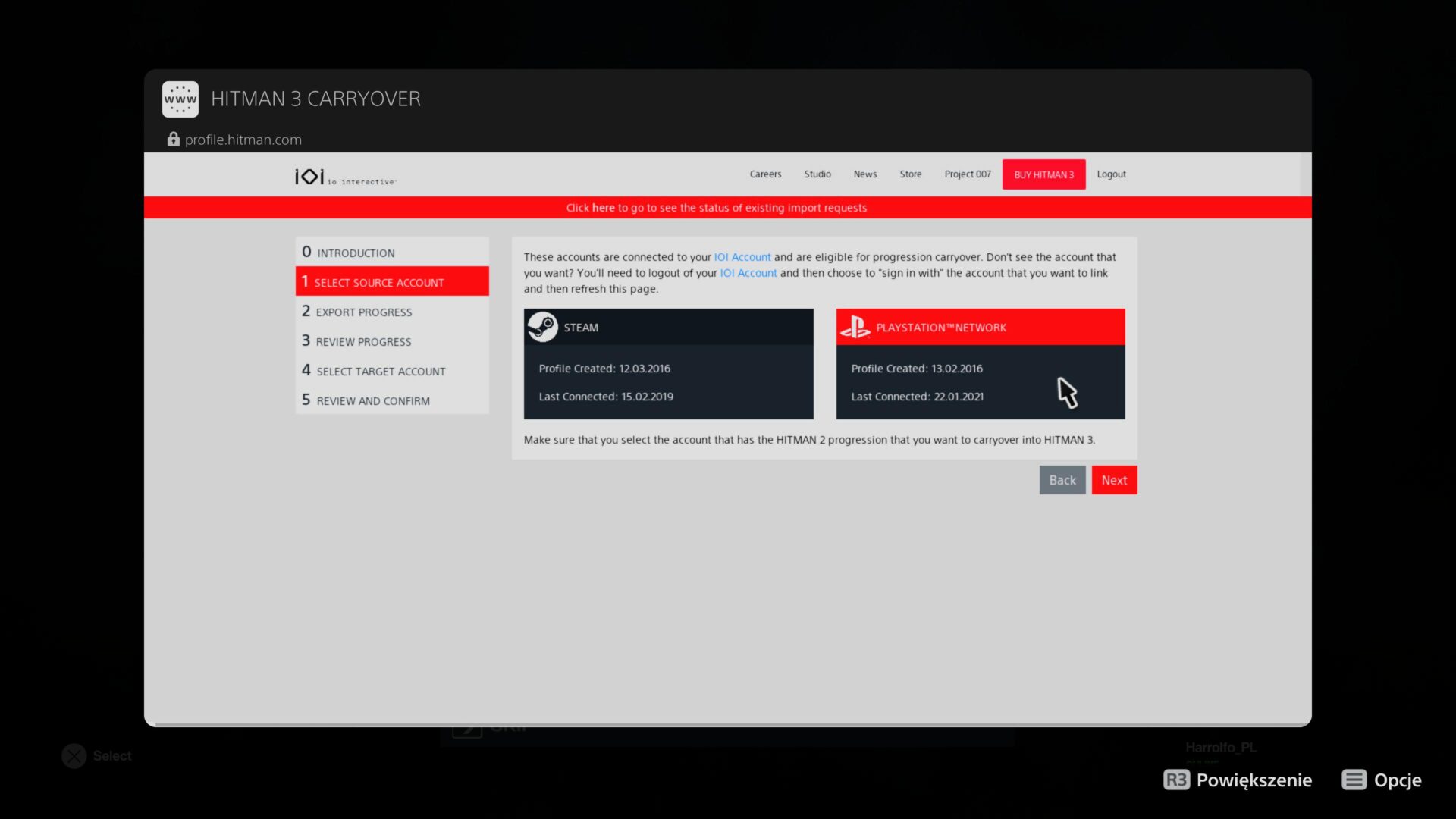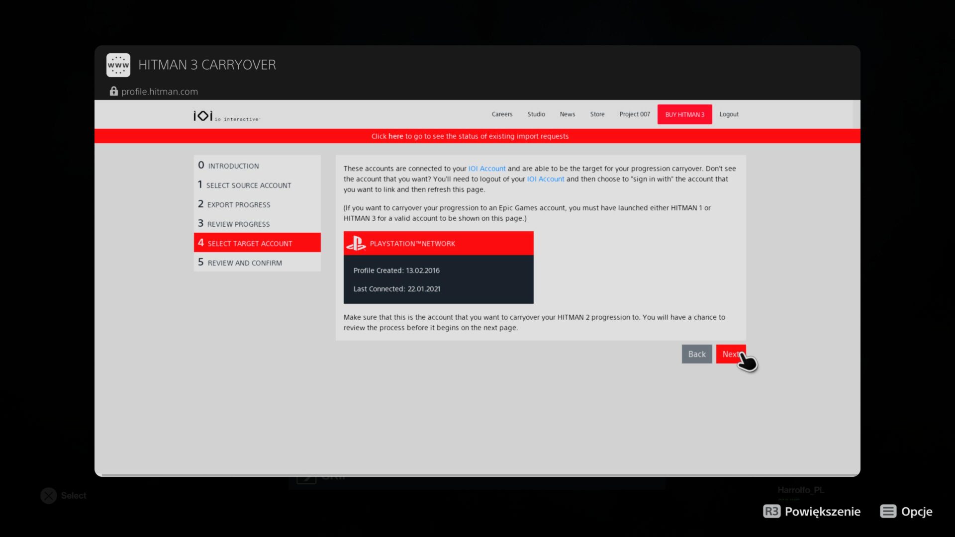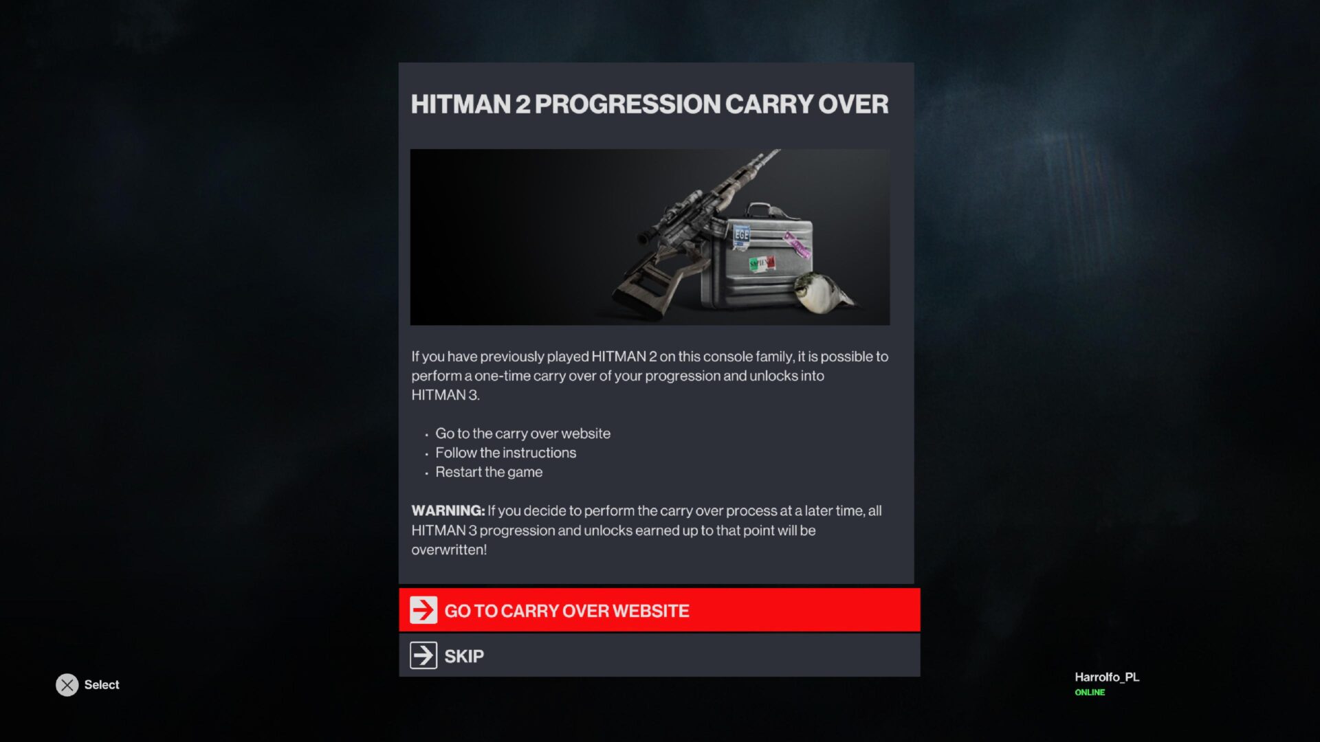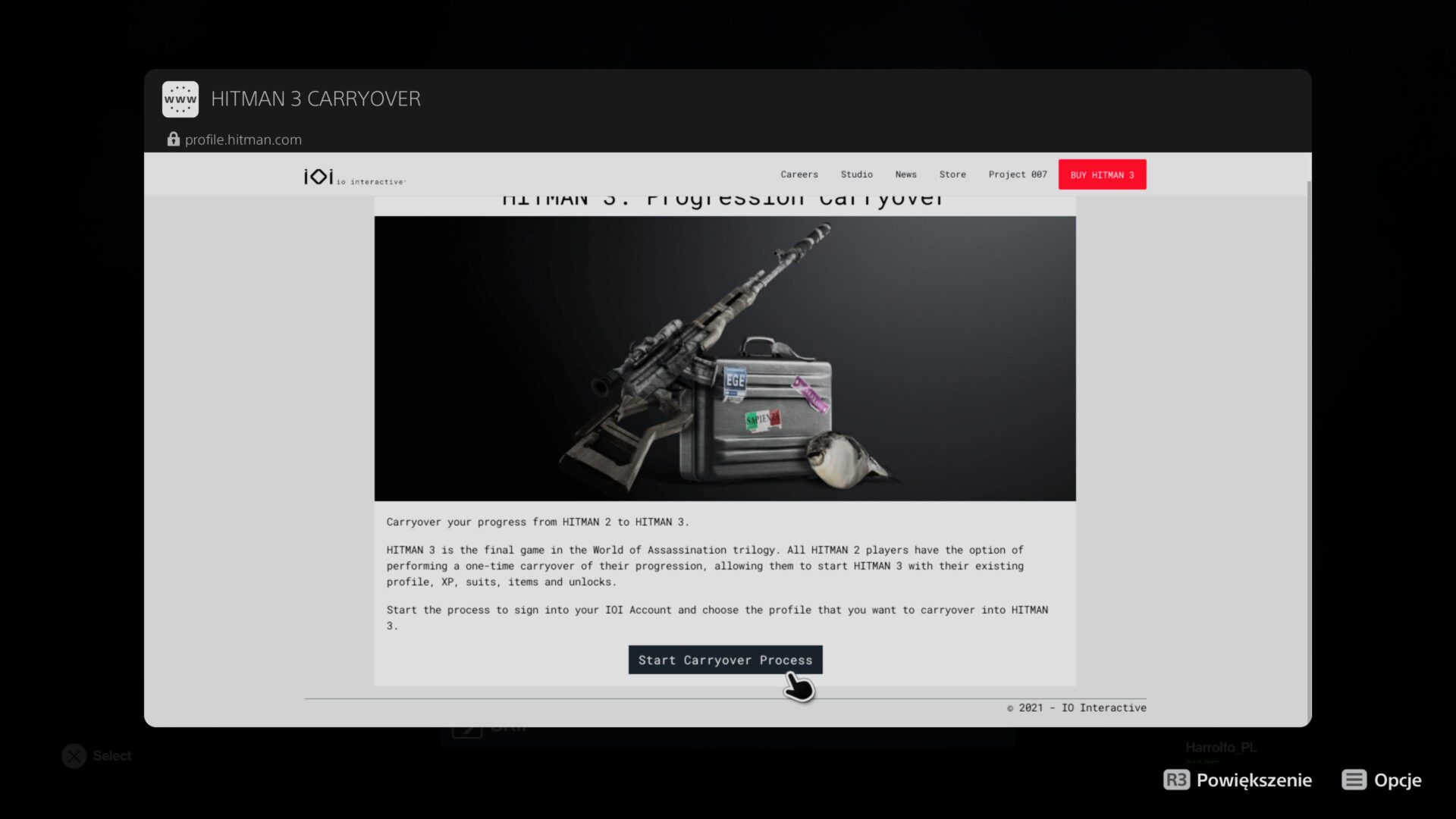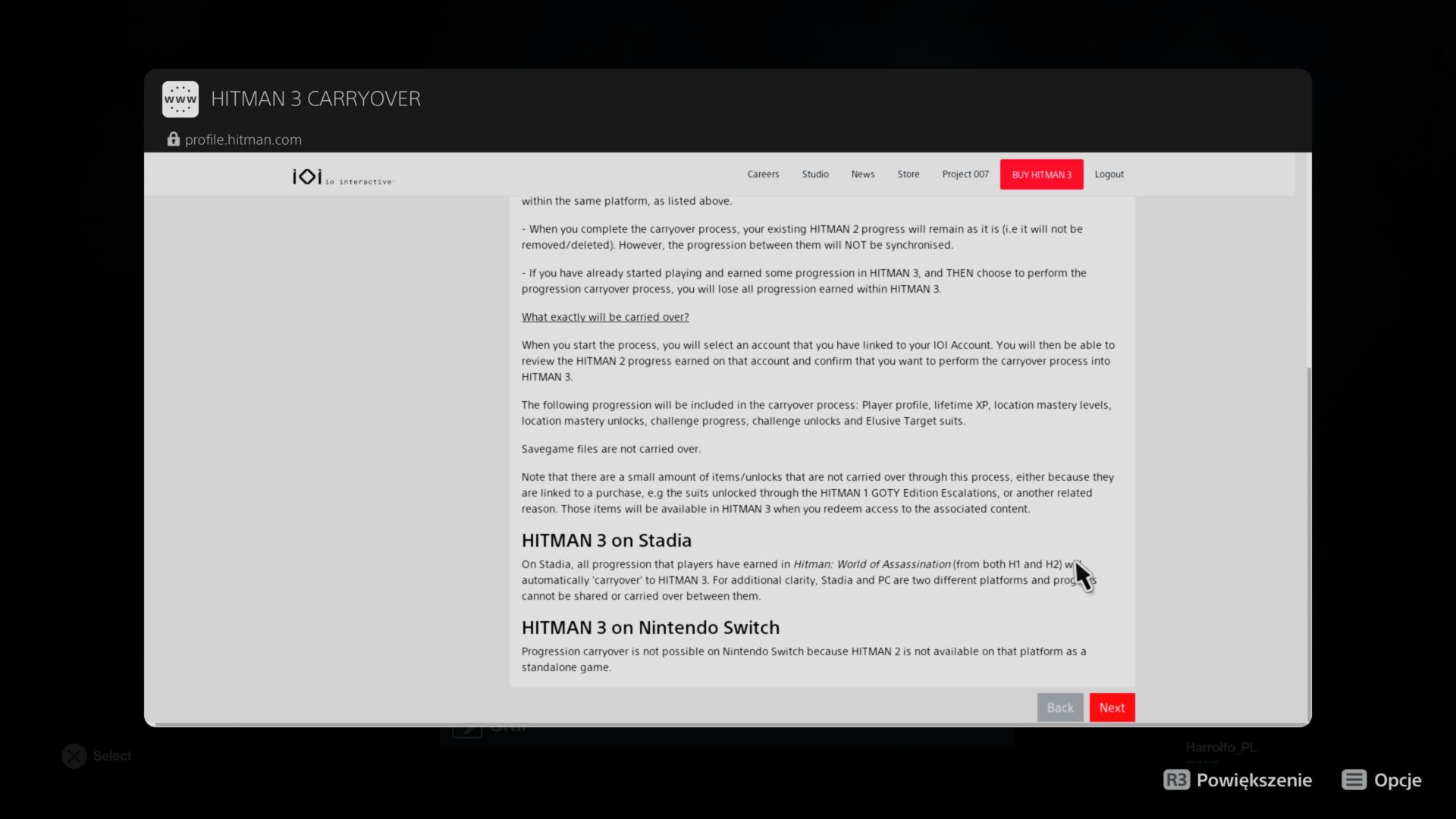 Jeśli więc chcemy przenieść swoje postępy z “dwójki” do “trójki”, wybieramy oczywiście opcję “Go to carry over website”. Dzięki wdrożonej w ten sposób procedurze będziemy mogli zaimportować do HITMAN 3 swój poziom gracza, rangę, poziomy opanowania lokacji, postęp w wyzwaniach, odblokowane wyposażenie i nagrody przyznane za zlikwidowanie Nieuchwytnych Celów. KONIECZNIE ROZPOCZNIJCIE TEN PROCES PRZED ROZPOCZĘCIEM SWOJEJ PRZYGODY Z HITMANEM 3 – WYMAŻE TO WASZ POSTĘP W NAJNOWSZEJ GRZE. Przenieść możemy jedynie stan z “dwójki” – nie ma możliwości zaimportowania go z pierwszej odsłony, chyba, ze graliście w poziomy z jedynki w “dwójce”.