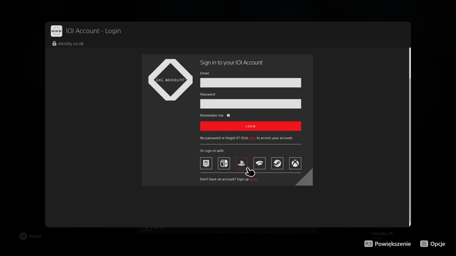 Musimy się zalogować na swoje konto IOI. Możliwe jest, że go nie posiadamy – możemy więc wybrać logowanie się za pomocą między innymi konta PlayStation lub Xbox. Ja gram na PS5, więc wybrałem konto PSN, po czym zobaczyłem poniższą stronę.