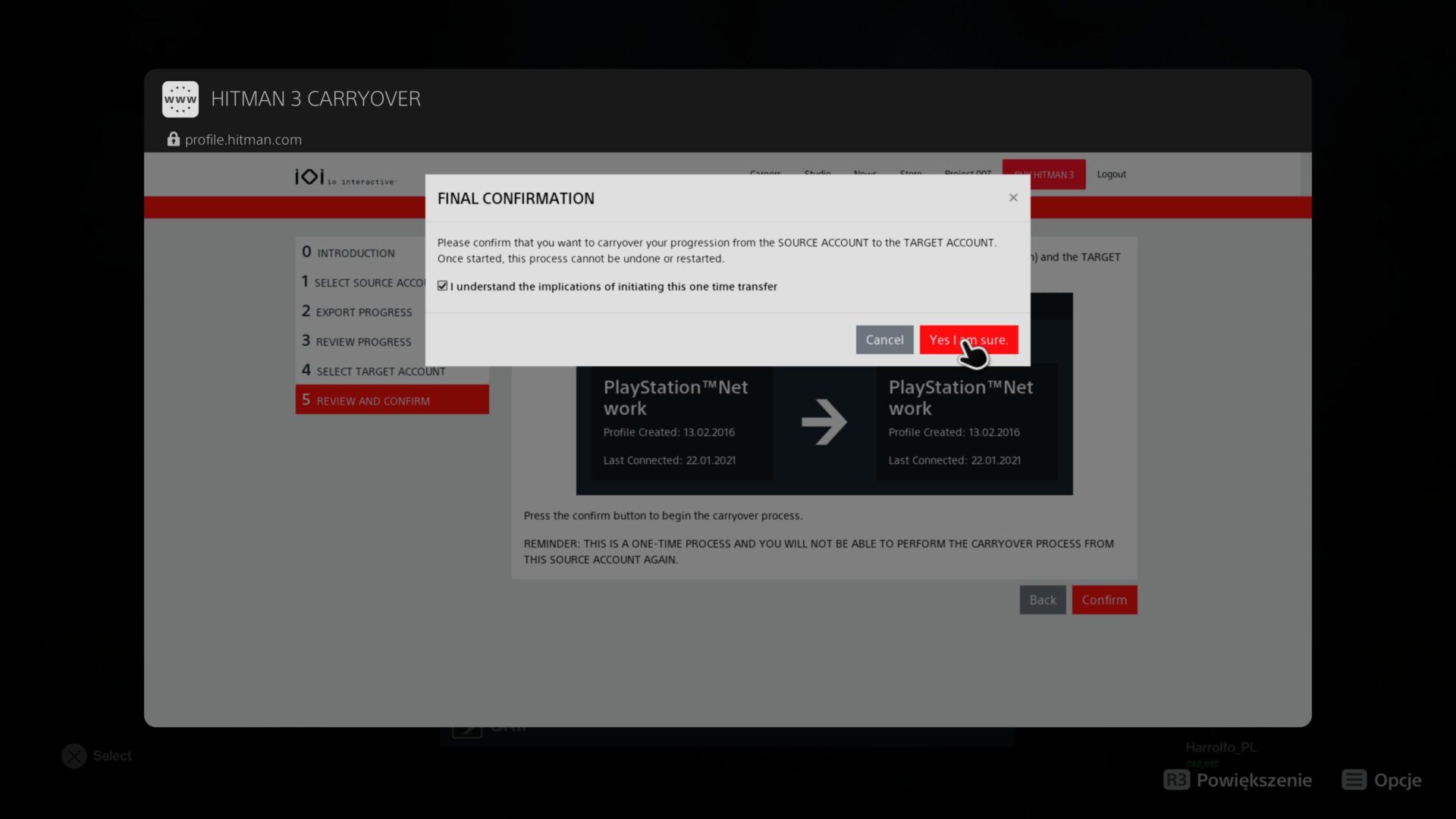 Jeszcze jedno potwierdzenie i za moment będziemy mogli się cieszyć przeniesionym progresem. Jeśli wszystko się zgadza, naciskamy Confirm i Yes, I’m sure.