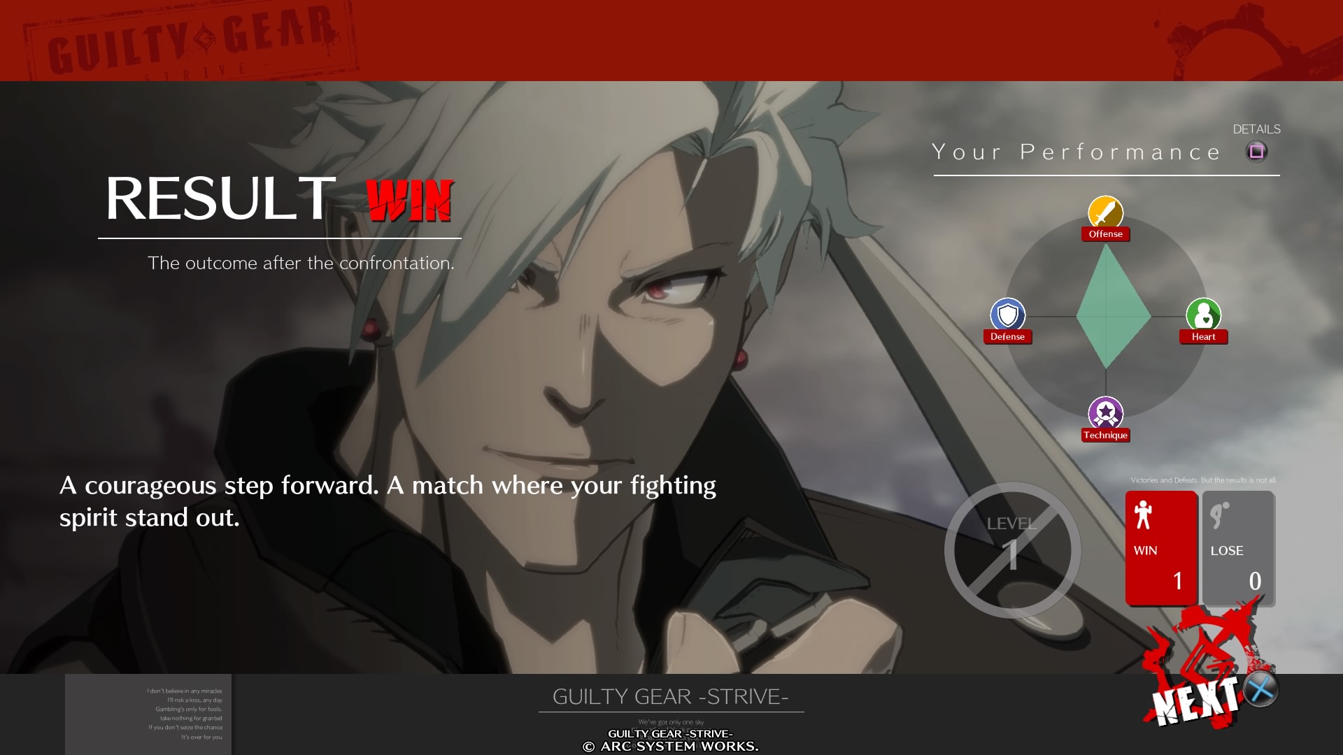 Po dołączeniu do gry przywitała mnie całkiem dobra muzyka w tle, oddająca to, co będzie się działo podczas walki. Menu główne okazało się całkiem czytelne i bogate, choć nie z każdej opcji można było skorzystać. Zabawę podzielono na dwa podstawowe tryby – rozgrywkę online i starcia offline. W becie, niestety, tryb story nie chciał działać i musimy na niego zaczekać do pełnej wersji. Guilty Gear Strive w wersji beta na pierwszy rzut oka prezentował się całkiem przyjemnie. Wizualna strona produkcji to duży plus, choć momentami brakowało płynności. O tym jednak za chwilę.