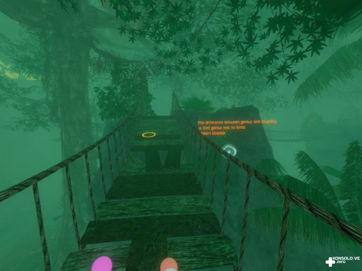 Mimo bardzo pozytywnych wrażeń wizualnych, nie mogę przejść obojętnie obok nierównej oprawy wizualnej. Mind Labyrinth: VR Dreams z daleka wygląda naprawdę ładnie. Sam projekt lokacji i efekty oświetleniowe robią bardzo pozytywne wrażenie i tytuł może się podobać. Jednak często podchodząc do jakiegoś elementu otoczenia, uderzą nas w oczy bardzo niskiej jakości tekstury – jak chociażby niżej widoczna rozmazana skała. Na szczęście czasy ładowania etapów są bardzo krótkie, a miejscówki są na tyle klimatyczne i pomysłowe, że doświadczanie wizji twórców sprawiało mi niekłamaną przyjemność. Nie mogę jednak nie wspomnieć o pewnym niedociągnięciu wizualnym. Nie podobają mi się też górnolotne cytaty, które pojawiają się po trafieniu odpowiedniej tabliczki strumieniem światła. Możemy wtedy przeczytać sentencje autorstwa Alberta Einsteina, Alfreda Hitchcocka czy Dalai Lamy. Mam jednak wrażenie, że niepotrzebnie mają one uczynić z tego tytułu coś więcej, jakieś filozoficzne doznanie, a nie pasuje to do dość hermetycznej i prostej wizji. Nie sprawia to jednak, że automatycznie nie warto zainteresować się tytułem.