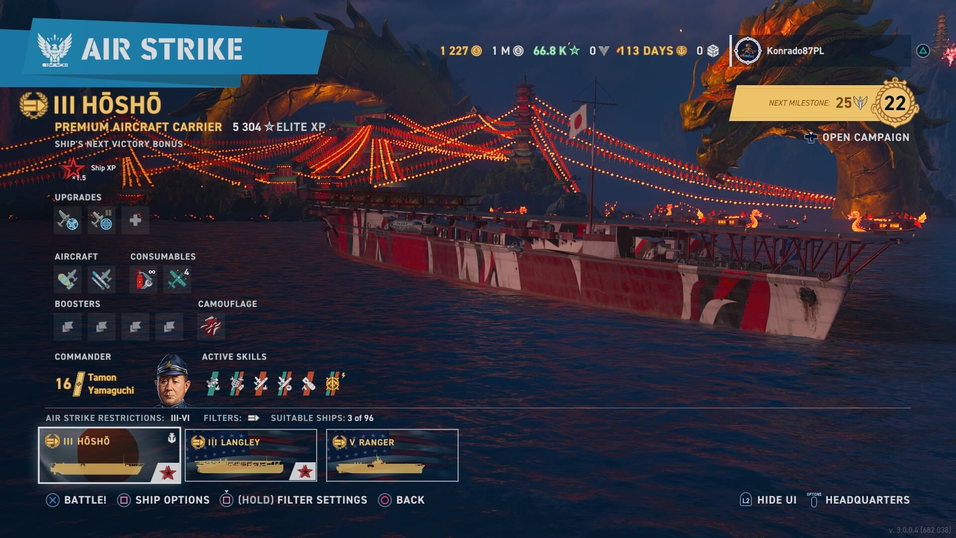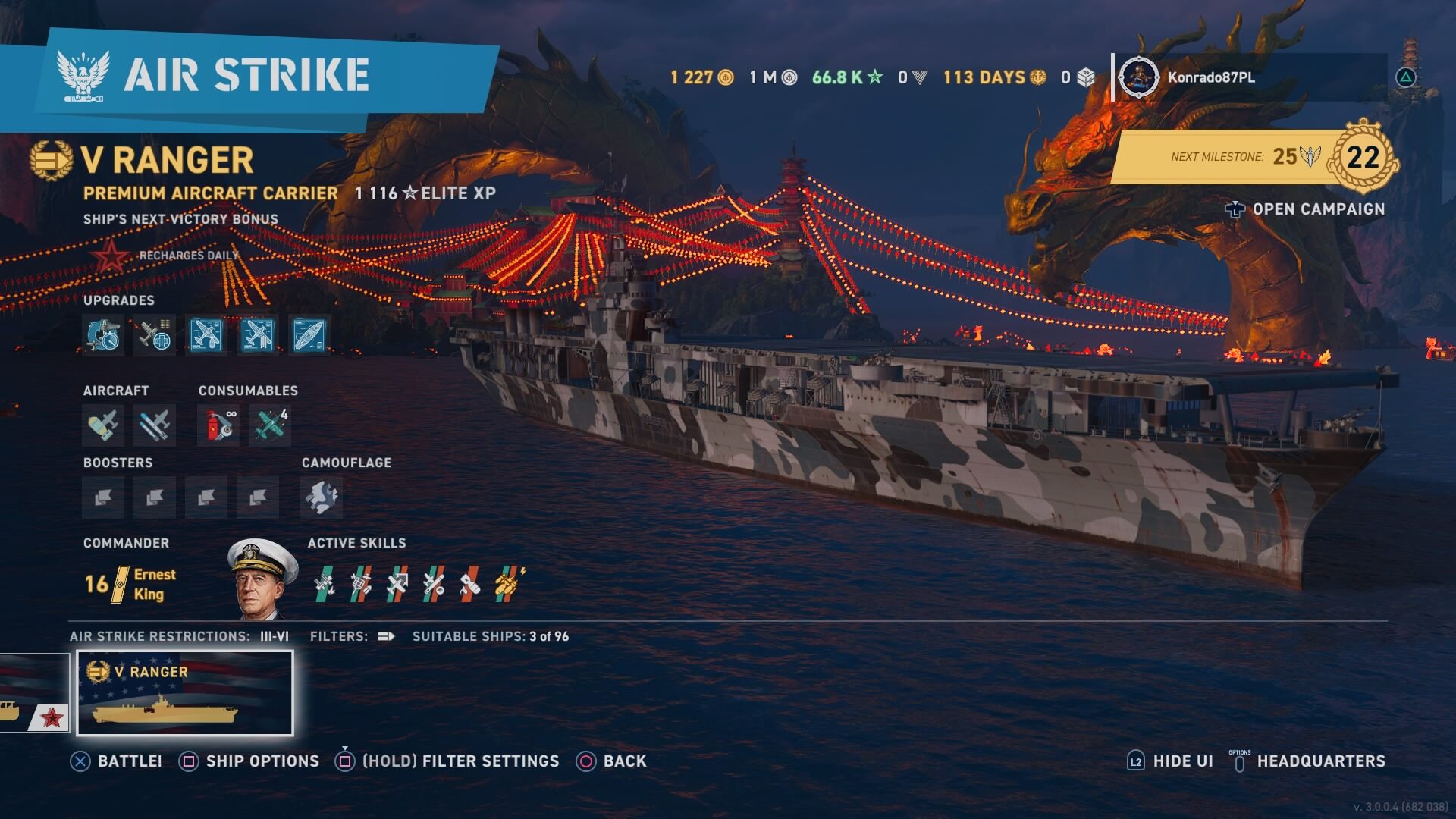 Lotniskowcami możemy grać jedynie w specjalnie przygotowanym do tego trybie „Air Strike”, na drużynę może przypadać tylko jeden lotniskowiec, jednak aby gracze nie musieli długo czekać na bitwę ponad połowę okrętów stanowią booty. Wybierając się na taki tryb normalnym okrętem można zarobić sporą liczę kredytów i doświadczenia, ale chyba nie o to chodziło twórcom.
